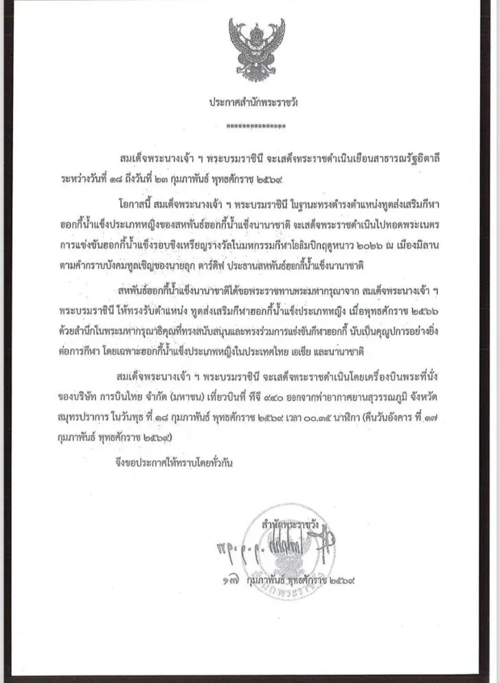 ประกาศระบุว่า สมเด็จพระนางเจ้า สุทิดา พัชรสุธาพิมลลักษณ พระบรมราชินี จะเสด็จพระราชดำเนินเยือนสาธารณรัฐอิตาลี ระหว่างวันที่ 18 ถึง 23 กุมภาพันธ์ พุทธศักราช 2569 โดยในการเสด็จพระราชดำเนินครั้งนี้ ทรงปฏิบัติพระราชกรณียกิจในฐานะทูตส่งเสริมกีฬาฮอกกี้น้ำแข็งประเภทหญิงของ สหพันธ์ฮอกกี้น้ำแข็งนานาชาติ