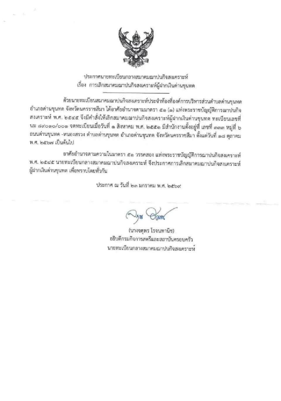 วันที่ 18 กุมภาพันธ์ 2569 มีการเผยแพร่ประกาศจากนายทะเบียนกลางเกี่ยวกับการเพิกถอนสถานะสมาคมฌาปนกิจหลายแห่งในหลายจังหวัด ทำให้ประชาชนที่เป็นสมาชิกเกิดความกังวลเกี่ยวกับความปลอดภัยของเงินออมเพื่อวาระสุดท้ายของชีวิต