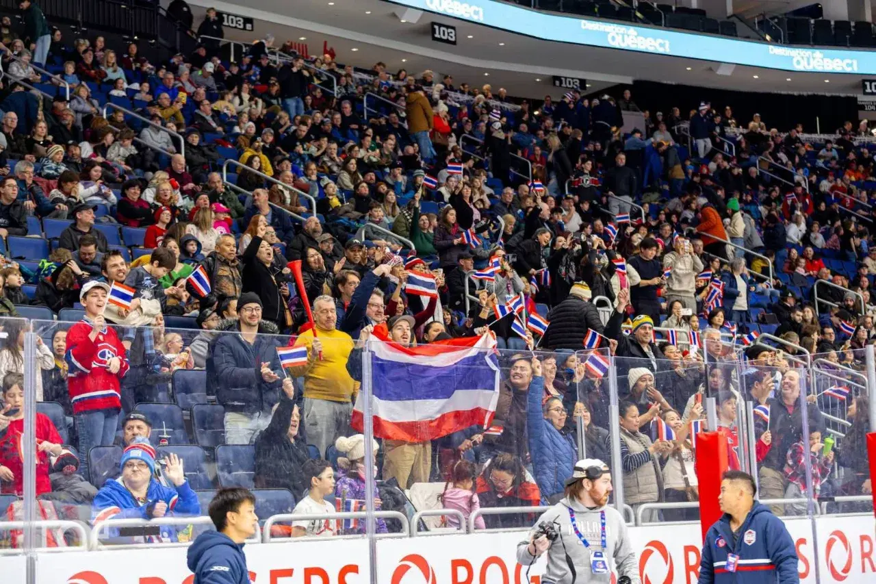 การแข่งขันจัดขึ้นที่ Centre Vidéotron อารีน่าความจุกว่า 20,000 ที่นั่ง โดยมีแฟนฮอกกี้เข้าชมกว่าครึ่งสนาม หรือมากกว่า 10,000 คน ท่ามกลางกองเชียร์ชาวไทยในแคนาดากว่า 100 ชีวิตที่รวมพลังส่งเสียงเชียร์ไม่ขาดสาย