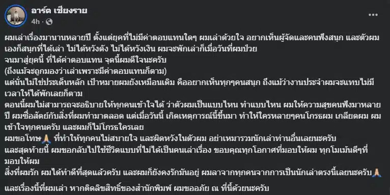 อาร์ต เชียงราย ชี้แจงเรื่องดราม่าห้องคลอดและประกาศหยุดเล่าผีในรายการเดอะ โกสท์เรดิโอ
