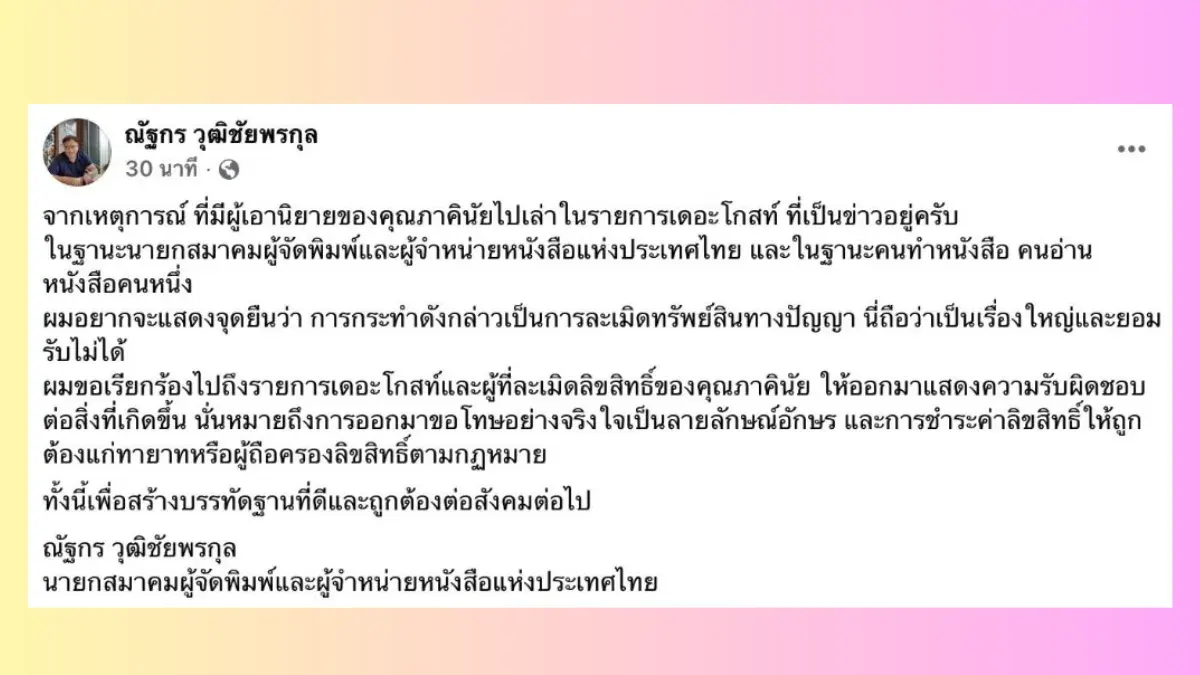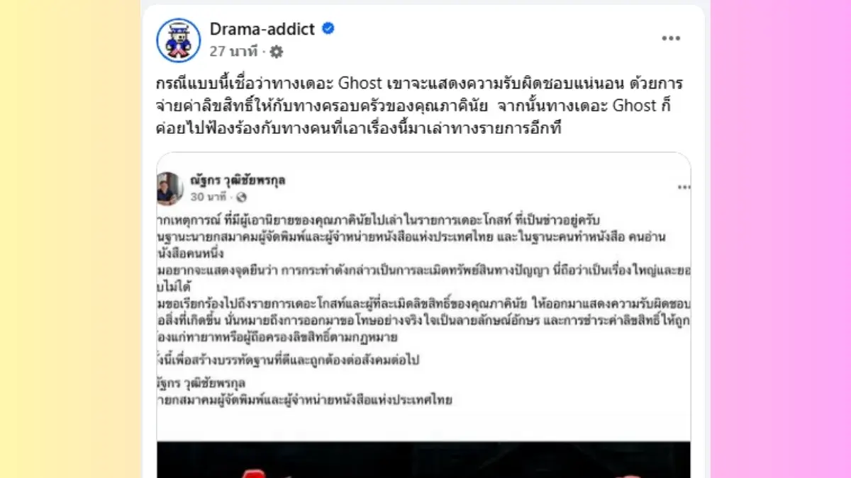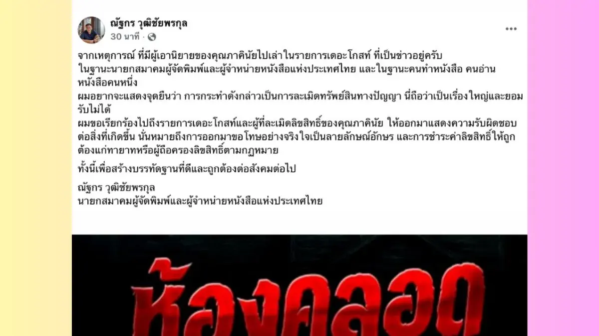 วงการนักเขียนเดือด! นายกสมาคมผู้จัดพิมพ์ฯ จี้ "เดอะโกสต์" รับผิดชอบ หลังพบการละเมิดลิขสิทธิ์นิยาย "ภาคินัย"