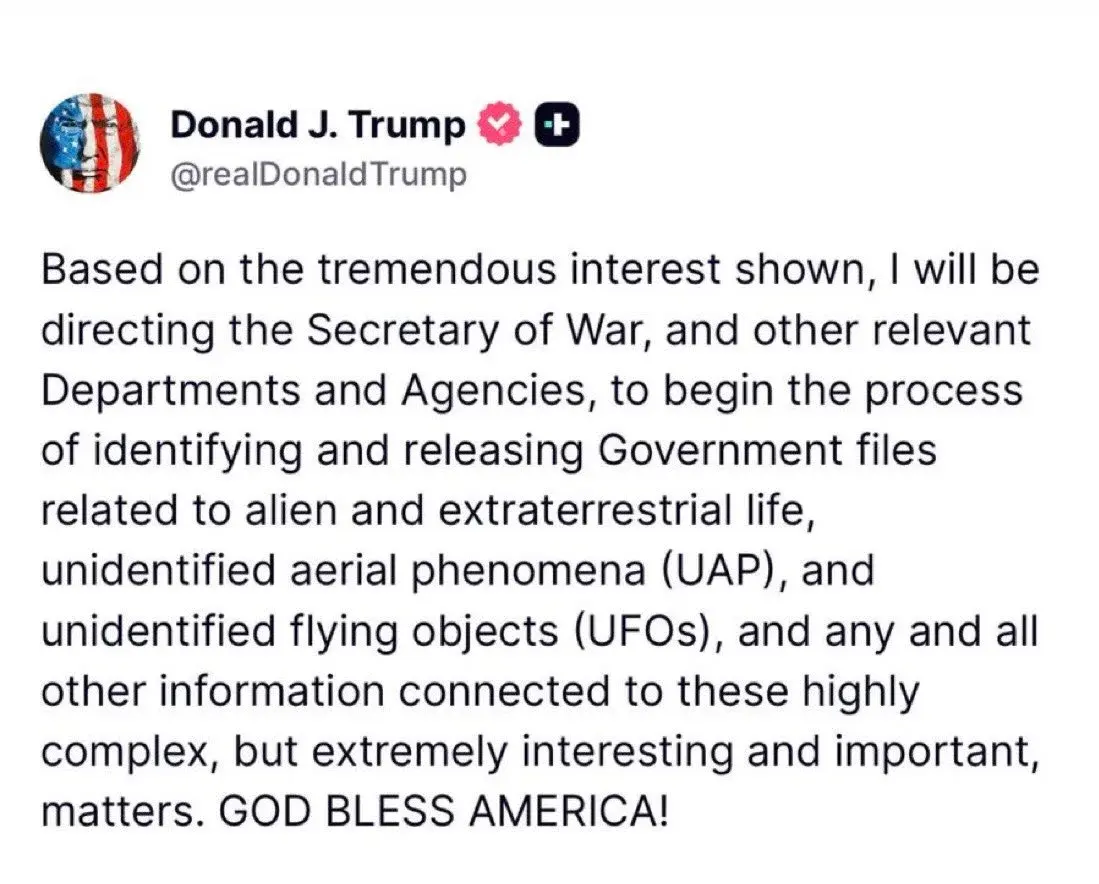 การประกาศดังกล่าว มีขึ้นบนแพลตฟอร์ม "ทรูธ โซเชียล" ของเขา เมื่อวันที่ 19 กุมภาพันธ์ที่ผ่านมา และ อาจถือเป็นจุดเปลี่ยนสำคัญ สำหรับผู้ที่ติดตามและเรียกร้อง ให้เปิดเผยเอกสารเหล่านี้มาเป็นเวลาหลายทศวรรษ โดย "โดนัลด์ ทรัมป์" กล่าวว่า "คำสั่งนี้มีขึ้นจากความสนใจอย่างล้นหลามของสาธารณชน" และ "จากความสนใจอย่างมากที่ได้รับ ผมจะสั่งการให้รัฐมนตรีว่าการกระทรวงกลาโหม และ หน่วยงานที่เกี่ยวข้อง เริ่มกระบวนการระบุและเปิดเผยแฟ้มเอกสารของรัฐบาล ที่เกี่ยวข้องกับมนุษย์ต่างดาว สิ่งมีชีวิตนอกโลก ปรากฏการณ์ทางอากาศ ที่ไม่สามารถระบุได้ และ วัตถุบินที่ไม่สามารถระบุได้"