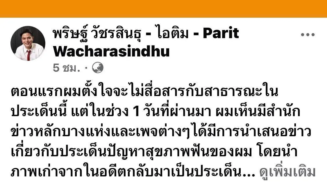 เมื่อวันที่ 20 กุมภาพันธ์ 2569 นายพริษฐ์ วัชรสินธุ ว่าที่ ส.ส.บัญชีรายชื่อ พรรคประชาชน ออกมาโพสต์ข้อความชี้แจงผ่านโซเชียลมีเดีย หลังจากมีสื่อกระแสหลักบางแห่งและเพจออนไลน์หลายเพจ นำภาพเก่าเกี่ยวกับปัญหาสุขภาพฟันของเขากลับมาเผยแพร่และตั้งประเด็นอีกครั้ง
