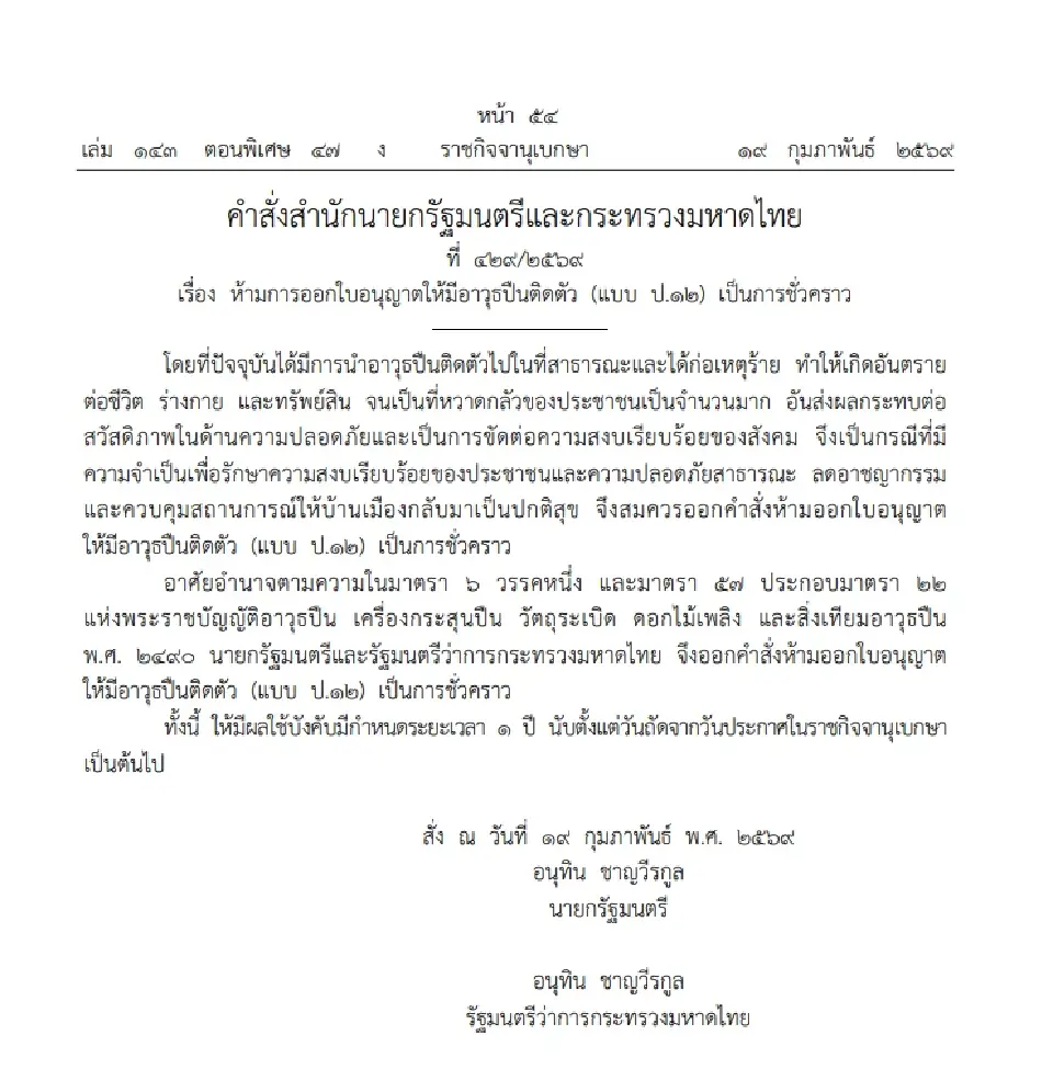 เมื่อวันที่ 20 ก.พ. 69 เว็บไซต์ราชกิจจานุเบกษาเผยแพร่คำสั่งจากสำนักนายกรัฐมนตรีและกระทรวงมหาดไทย ห้ามการออกใบอนุญาตพกปืน (แบบ ป.12) ชั่วคราว โดยระบุว่า การนำอาวุธปืนไปในที่สาธารณะก่อให้เกิดอันตรายต่อชีวิตและทรัพย์สิน ทำให้ประชาชนหวาดกลัว ส่งผลกระทบต่อความปลอดภัยและความสงบเรียบร้อยในสังคม