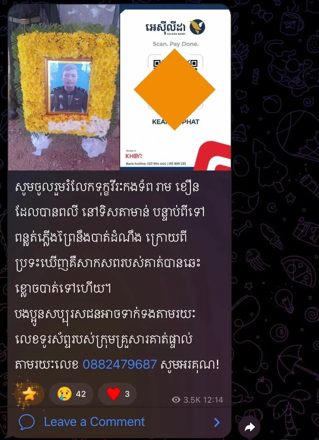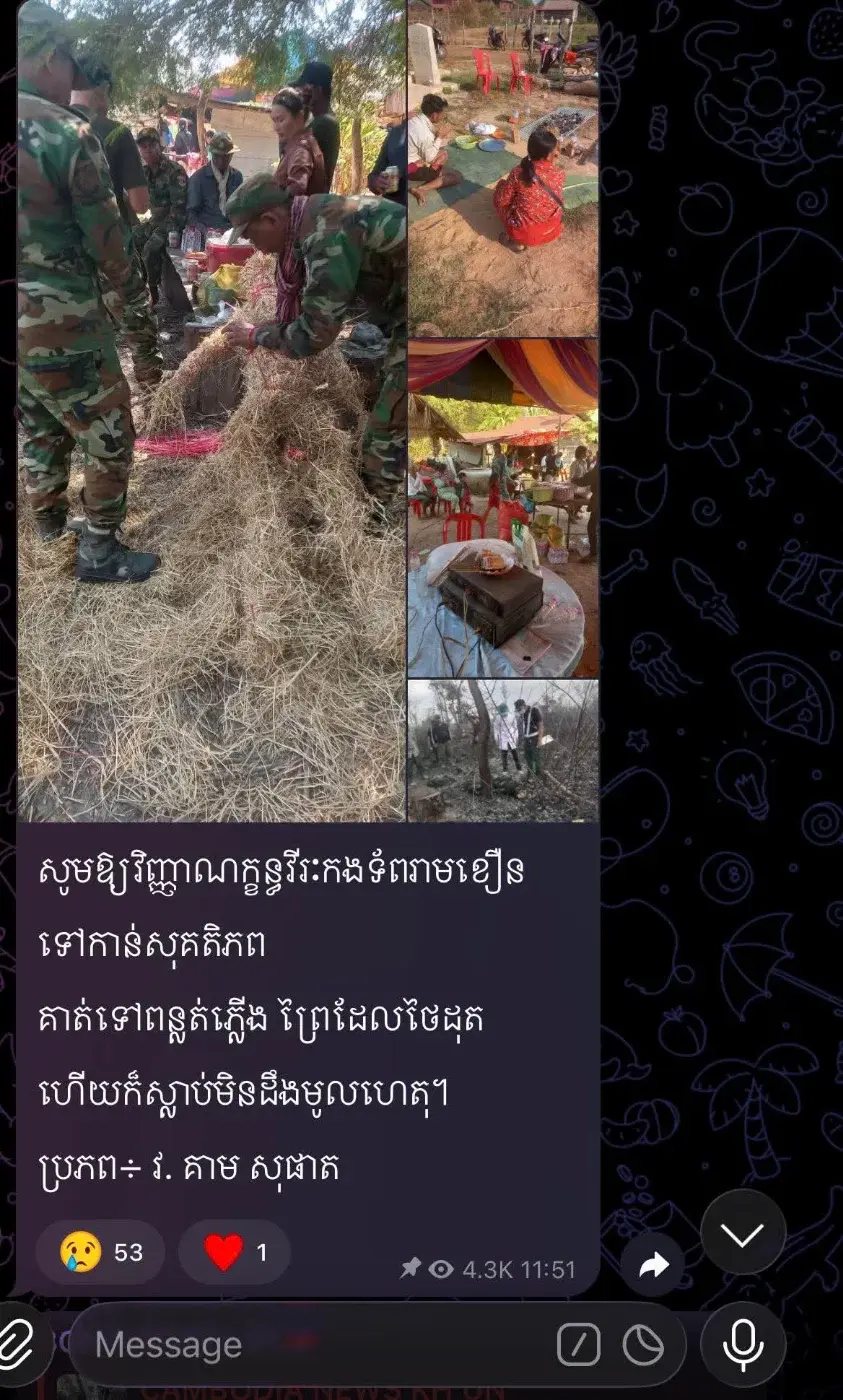 รายงานระบุว่า ผู้เสียชีวิตคือ “เรียม เคือญ” ทหารสังกัดกองทัพกัมพูชา โดยพบศพตั้งแต่วันที่ 20 กุมภาพันธ์ที่ผ่านมา ก่อนที่ญาติจะเร่งประกอบพิธีฌาปนกิจในช่วงเช้าวันที่ 21 กุมภาพันธ์ และเก็บอัฐิเป็นที่เรียบร้อย