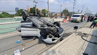 ระทึกกลางวัน! เก๋งพลิกคว่ำหน้ารร.พาเลซ บางพลี เจ็บ 2 จราจรติดขัดต้องสลับเลน
