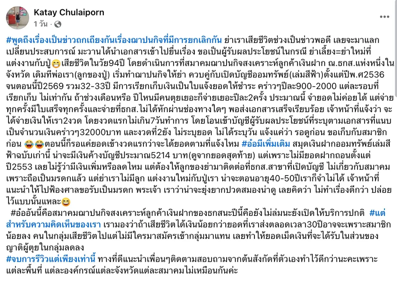 เจ้าตัวได้อัปเดตข้อมูล โดยระบุว่าเอกสารที่ยื่นขอรับผลประโยชน์ในกรณีย่าเลี้ยงที่เสียชีวิตในวัย 94 ปี โดยเริ่มทำฌาปนกิจตั้งแต่ปี 2536 จนถึงปี 2569 รวม 32-33 ปี มีการเรียกเก็บเงินปีละประมาณ 900-2000 บาท ขึ้นอยู่กับจำนวนสมาชิกในกลุ่ม