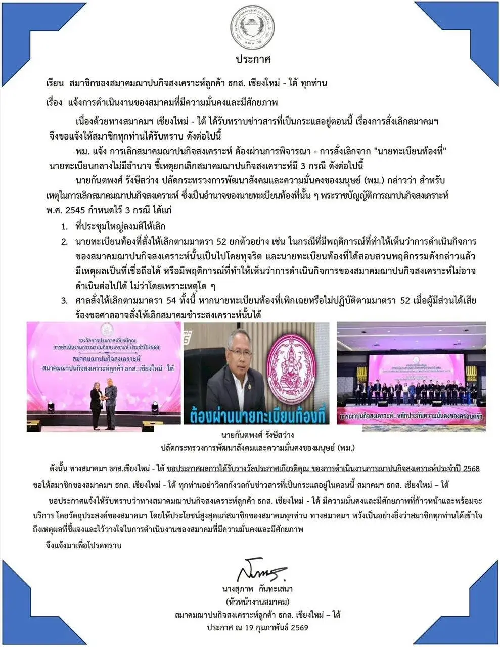สมาคมฌาปนกิจสงเคราะห์ลูกค้า ธกส. เชียงใหม่–ใต้ ชี้แจงข่าวลือ “ยุบสมาคม” ยืนยันยังดำเนินงานมั่นคงตามกฎหมาย พร้อมแจงขั้นตอนการยกเลิกสมาคมต้องผ่านนายทะเบียนท้องที่เท่านั้น