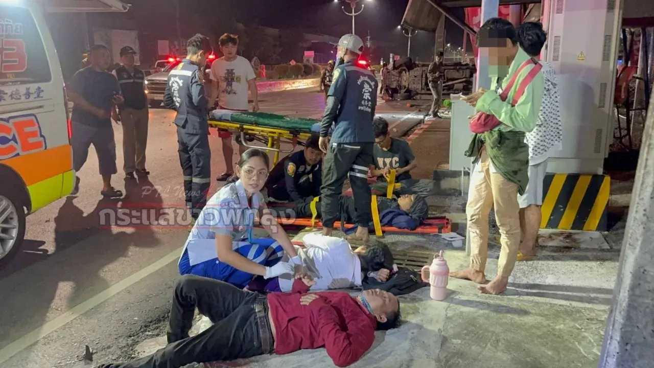แรงกระแทกส่งผลให้มีผู้ได้รับบาดเจ็บรวม 9 ราย ภรรยาของนายพิษณุได้รับบาดเจ็บ ขณะที่ตัวเขาและลูกชายมีอาการปวดเมื่อยตามร่างกาย อยู่ระหว่างตรวจรักษา ส่วนกลุ่มคนงานชาวเมียนมาทั้งหมดได้รับบาดเจ็บ โดยบางรายอาการสาหัส แพทย์อยู่ระหว่างประเมินอาการอย่างใกล้ชิด ด้านนายนิพล คนขับรถฟอร์ด บาดเจ็บเล็กน้อย และกำลังให้ปากคำกับเจ้าหน้าที่