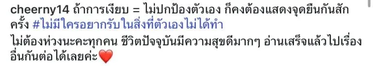 ล่าสุด สาวเชียร์ได้ออกมาเคลื่อนไหวผ่านอินสตาแกรมส่วนตัว cheerny14 ด้วยข้อความที่ชัดเจนและตรงไปตรงมา โดยระบุว่า “ถ้าการเงียบ = ไม่ปกป้องตัวเอง ก็คงต้องแสดงจุดยืนกันสักครั้ง #ไม่มีใครอยากรับในสิ่งที่ตัวเองไม่ได้ทำ” พร้อมย้ำว่าชีวิตปัจจุบันของเธอมีความสุขดี