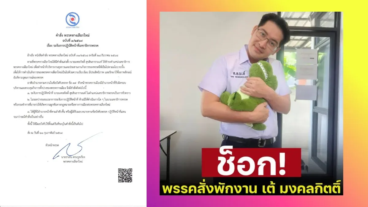 "เต้ มงคลกิตติ์" เกมเเล้ว!...: พรรคทางเลือกใหม่สั่งพักงาน "มงคลกิตติ์" ระงับหน้าที่เลขาธิการพรรคชั่วคราว