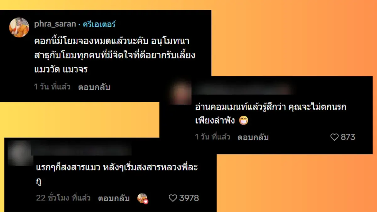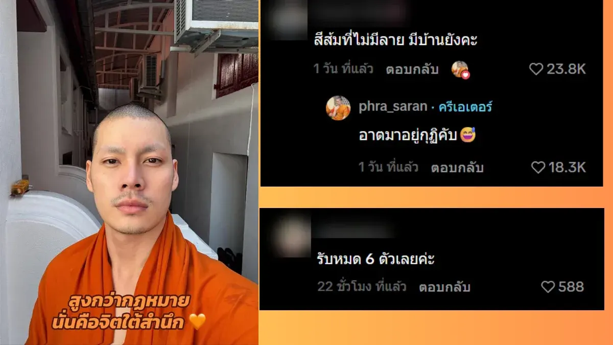 ทว่าสิ่งที่ทำให้คลิปนี้กลายเป็นไวรัลจนมียอดเข้าชมทะลุ 2.7 ล้านครั้ง กลับไม่ใช่เพียงความน่ารักของลูกแมวเท่านั้น แต่ความใจดีและรูปลักษณ์ของหลวงพี่ทำให้ชาวเน็ต โดยเฉพาะเหล่าสีกาและทาสแมว ต่างพากัน "หลุดโฟกัส" จนเกิดคอมเมนต์ขำขันเชิงหยอกล้อในทางโลก เช่น "สีส้มที่ไม่มีลาย มีบ้านหรือยังคะ" ซึ่งหมายถึงพระศรัณย์ที่ครองจีวรสีส้มอยู่นั่นเอง ทำให้หลวงพี่ต้องเข้ามาตอบกลับด้วยอารมณ์ขันตามหลักธรรมว่า "อาตมาอยู่กุฏิครับ" เพื่อเป็นการยืนยันสถานะความเป็นสงฆ์ที่บวชเรียนมาตั้งแต่เดือนมีนาคม 2568 จนถึงปัจจุบัน