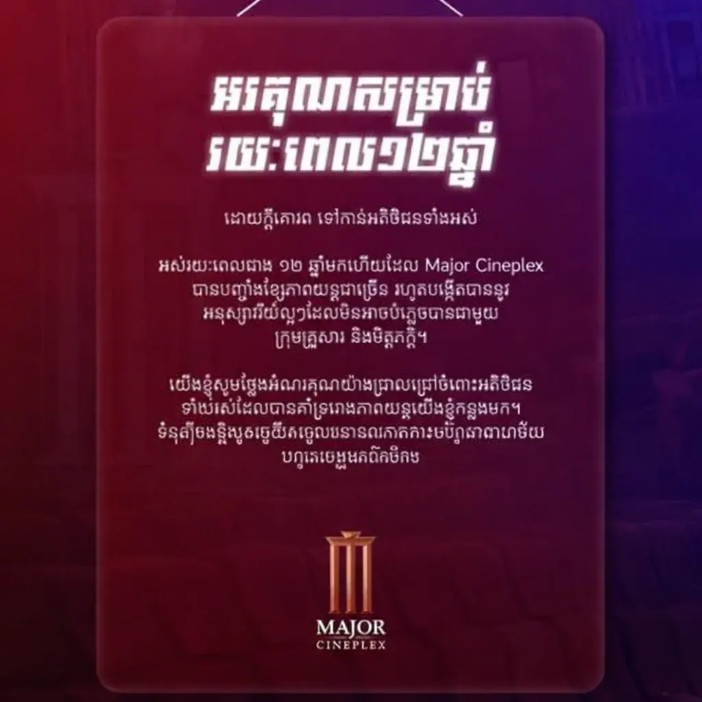 ตามรายงานของเว็บไซต์ข่าวคิริโพสต์ เขาอ้างถึงโพสต์บนเฟซบุ๊กของ “เมเจอร์ ซีนีเพล็กซ์ กัมพูชา” ที่เหมือนเป็นข้อความบอกลาลูกค้า อ่านแล้วโทนจะประมาณว่าเขาอยากขอบคุณคนดูและคนที่สนับสนุนมาตลอด ขอบคุณ “ความไว้วางใจและความรัก” ที่มีให้กันตลอดเส้นทางที่อยู่ร่วมกันมา เขียนแบบสุภาพและอบอุ่น เหมือนสรุปบทหนึ่งของธุรกิจที่เดินมานานพอสมควรแล้วกำลังจะปิดฉากลง