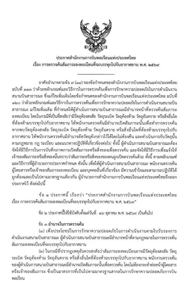 สำนักงานการบินพลเรือนแห่งประเทศไทย (CAAT) หรือ กพท. ยกระดับมาตรการความปลอดภัยน่านฟ้าไทยสู่มาตรฐานสากล ออกประกาศฉบับใหม่ พ.ศ. 2569 ปรับปรุงหลักเกณฑ์การตรวจค้นสัมภาระลงทะเบียนหรือกระเป๋าโหลดใต้เครื่อง (Checked Baggage) โดยให้อำนาจเจ้าหน้าที่ตรวจค้นอย่างเด็ดขาดเพื่อสกัดกั้นวัตถุอันตรายและสิ่งของต้องห้ามที่มีผลต่อความปลอดภัยทางการบิน