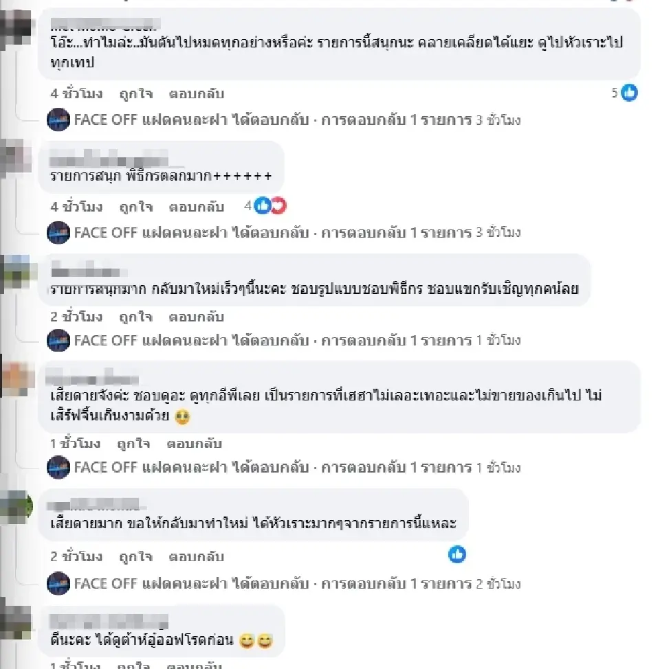 หลังจากประกาศ แฟนคลับแสดงความเสียดายจำนวนมาก โดยบอกว่ารายการสนุกและคลายเครียด แม้จะปิดฉากลงอย่างกะทันหัน แต่แฟนๆ ยังคงรอคอยการกลับมาของ “Face Off แฝดคนละฝา” ในเวอร์ชันที่น่าตื่นเต้นกว่าเดิม