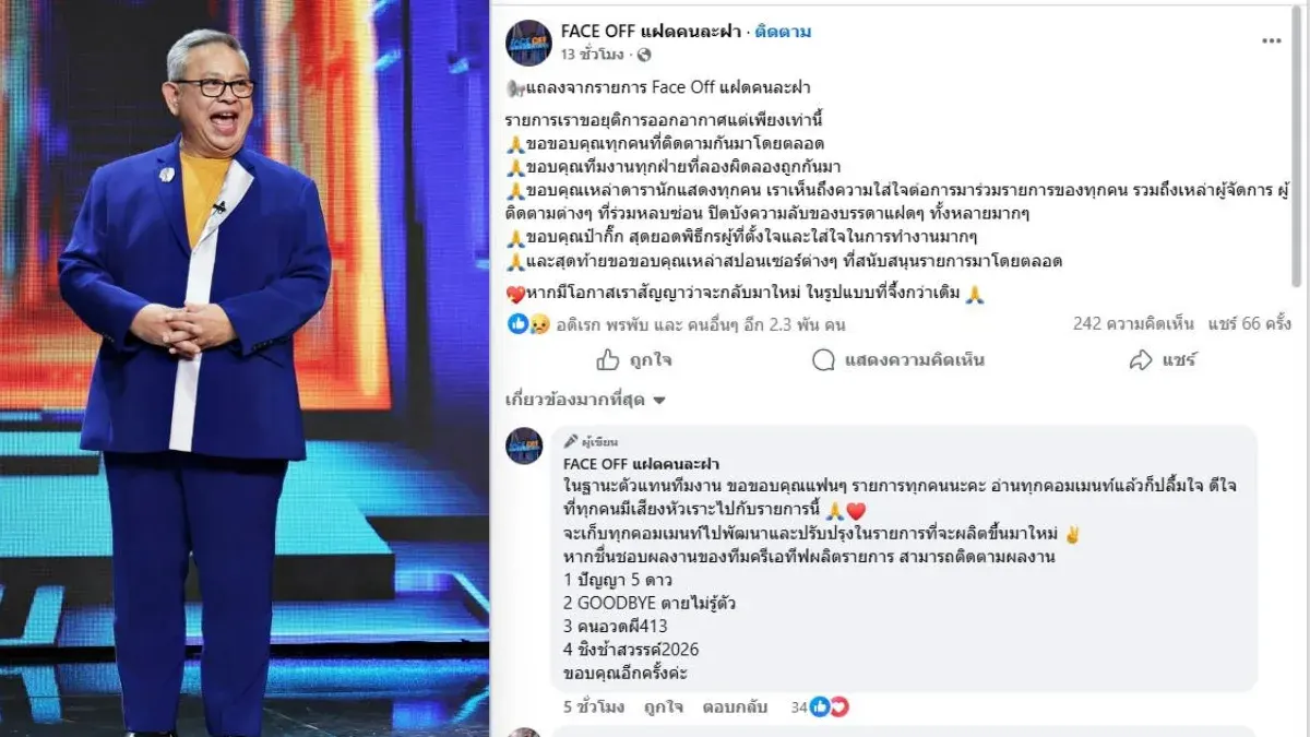 วงการวาไรตี้เมืองไทยต้องพบกับข่าวช็อกส่งท้ายสัปดาห์ เมื่อรายการที่เคยสร้างปรากฏการณ์ความล้ำสมัยด้วยเทคโนโลยี AI อย่าง "FACE OFF แฝดคนละฝา" จากค่ายเวิร์คพอยท์ ได้ประกาศยุติการออกอากาศอย่างเป็นทางการ ทิ้งไว้เพียงความทรงจำแห่งรอยยิ้มและเสียงหัวเราะที่เคยสร้างความสนุกสนานให้แก่ทุกครอบครัวตลอดช่วงเวลาที่ผ่านมา ท่ามกลางกระแสความเสียดายของเหล่าแฟนรายการที่เฝ้าติดตามบทพิสูจน์ความเนียนของแฝดคนละฝาในทุกสัปดาห์