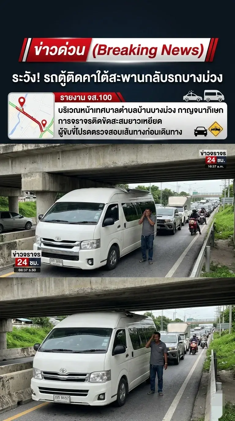 ใครกำลังมุ่งหน้าถนนกาญจนาภิเษก เช็กด่วน! จส.100 รายงานเหตุรถตู้กะระยะพลาด หลังคาติดคาใต้สะพานกลับรถ บริเวณหน้าเทศบาลตำบลบ้านบางม่วง ขยับไปไหนไม่ได้ ทำเอารถตามหลังติดสะสมยาวเหยียด 🚙🚗🚕