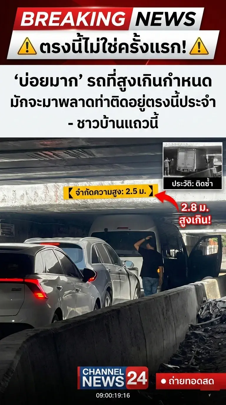 📍ตรงนี้ไม่ใช่ครั้งแรก! ชาวบ้านแถวนี้บอกเป็นเสียงเดียวกันว่า "บ่อยมาก" รถที่สูงเกินกำหนดมักจะมาพลาดท่าติดอยู่ตรงนี้ประจำ