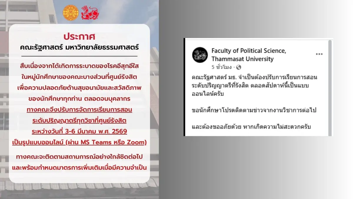 คณะรัฐศาสตร์ มหาวิทยาลัยธรรมศาสตร์ ออกประกาศด่วนให้งดการเรียนการสอนในรูปแบบปกติ ณ ศูนย์รังสิต เป็นเวลา 4 วัน ตั้งแต่วันที่ 3-6 มีนาคม 2569 เพื่อสกัดกั้นการแพร่ระบาดของโรคอีสุกอีใส หลังพบนักศึกษาบางส่วนเริ่มมีอาการป่วย โดยเน้นย้ำความปลอดภัยของนักศึกษาและบุคลากรเป็นสำคัญ
