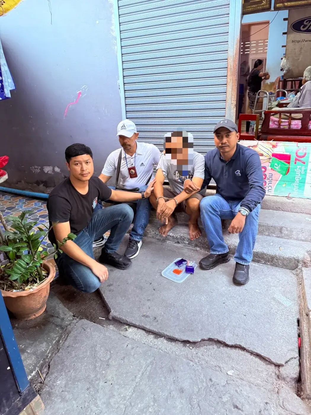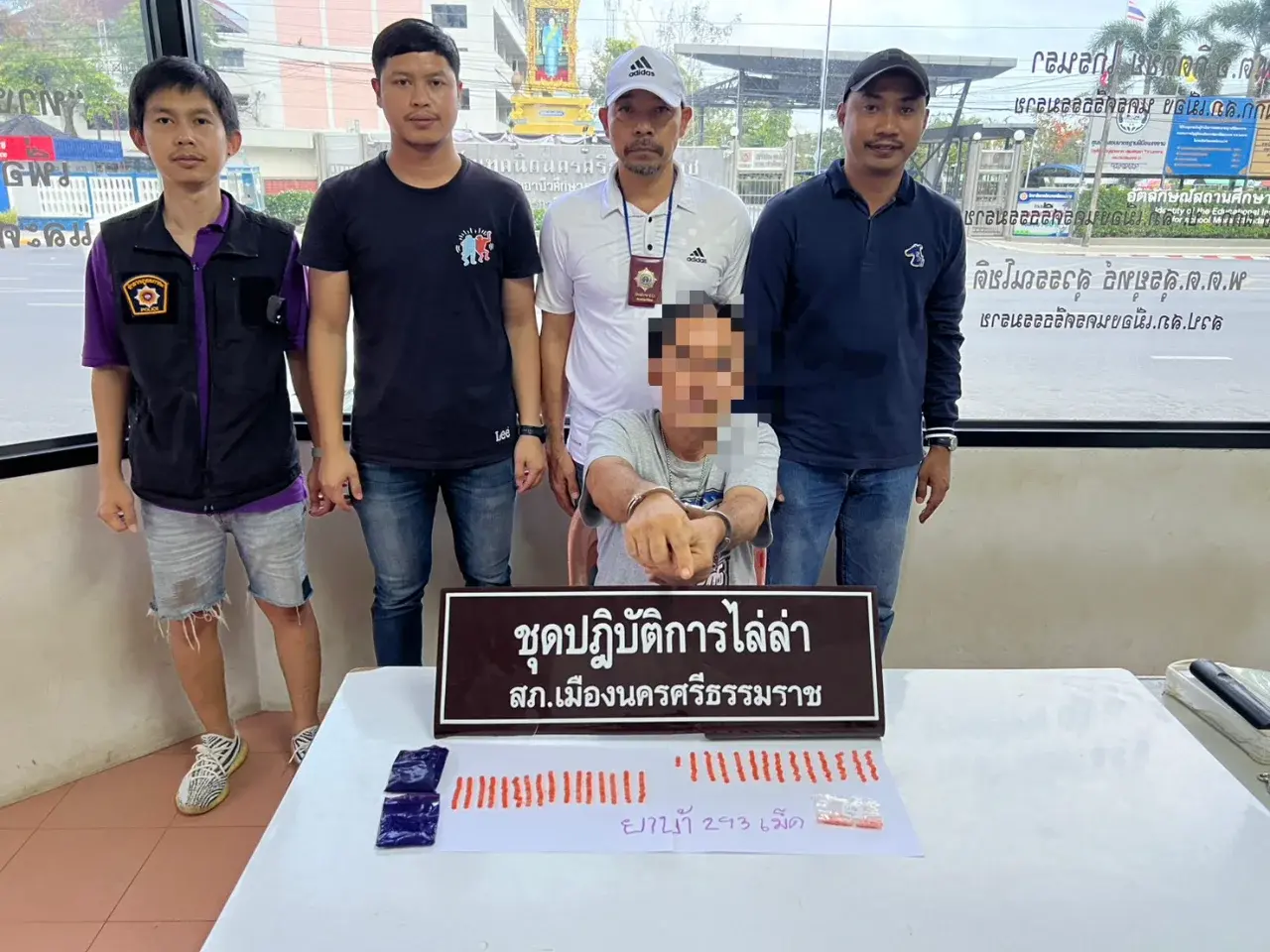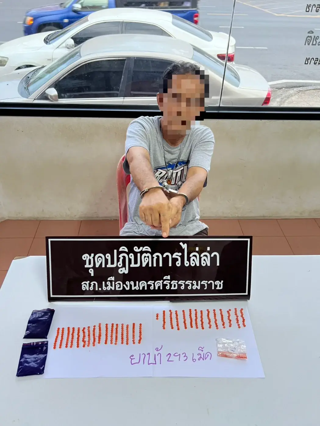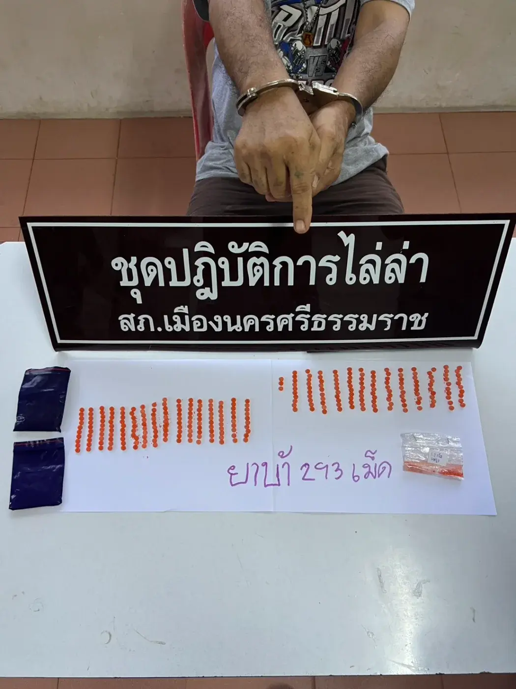 นายชัย มะขามชุม เกิดไหวตัวทัน พยายามวิ่งหลบหนีเข้าไปภายในชุมชน พร้อมกับทิ้งยาเสพติด แต่สุดท้ายไม่รอด ถูกจับกุมได้ด้วยความทุลักทุเล พร้อมของกลางยาบ้า 293 เม็ด ควบคุมตัวสอบสวน รับสารภาพว่า ซื้อยาบ้ามาจากเอเย่นต์ เพื่อแบ่งขายให้วัยรุ่นในราคาเม็ดละ 30 – 40 บาท จึงนำตัวไปสอบสวนขยายผล ตรวจปัสสาวะพบสารเสพติด ดำเนินคดีข้อหาจำหน่ายยาเสพติดให้โทษประเภท 1 (ยาบ้า) มีไว้เพื่อจำหน่ายเพื่อการค้า และเสพยาเสพติด