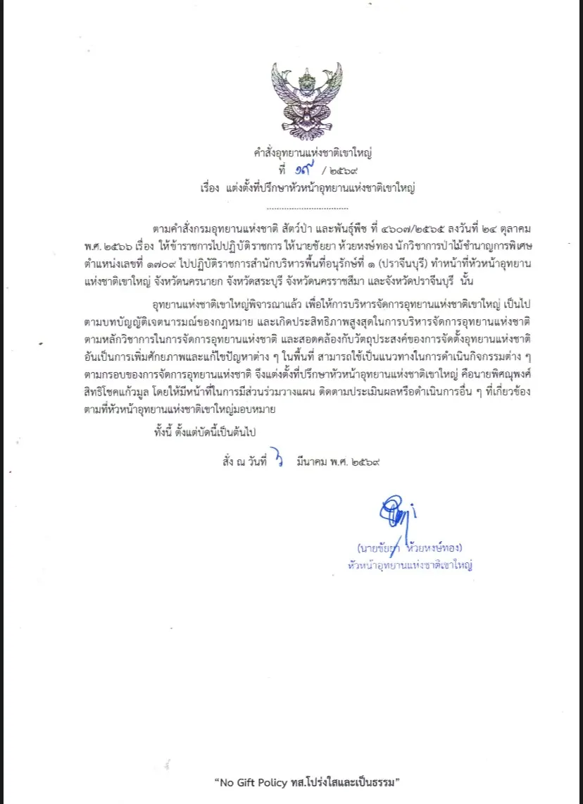 อุทยานแห่งชาติเขาใหญ่ (7 มีนาคม 2569) – นายชัยยา ห้วยหงษ์ทอง หัวหน้าอุทยานแห่งชาติเขาใหญ่ ลงนามแต่งตั้ง นายพิศณุพงศ์ สิทธิโชคแก้วมูล ดำรงตำแหน่งที่ปรึกษาหัวหน้าอุทยานฯ เพื่อเสริมศักยภาพการบริหารจัดการพื้นที่มรดกโลก ครอบคลุมพื้นที่ 4 จังหวัด มุ่งเน้นความโปร่งใสและหลักวิชาการตามนโยบาย No Gift Policy