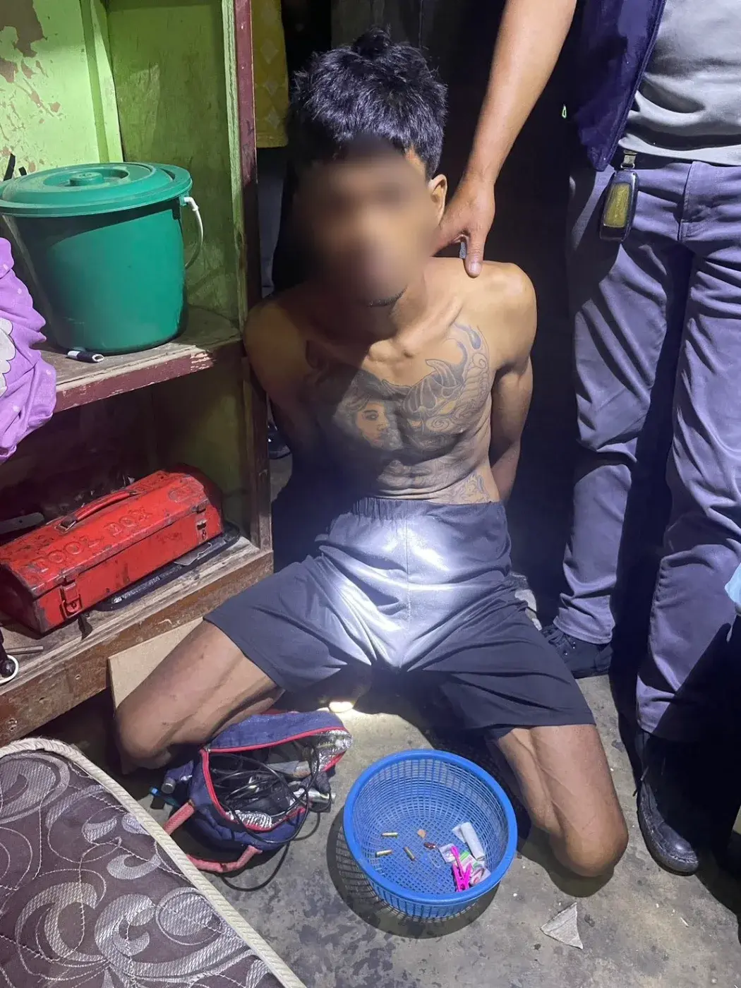 เมื่อถึงที่เกิดเหตุพบผู้เสียหาย ให้การว่า คนก่อเหตุชื่อนายบี อายุ 26 ปี บ้านอยู่ไม่ไกลจากที่เกิดเหตุมากนัก กำลังเจ้าหน้าที่จึงเดินทางไปตรวจสอบที่บ้าน หว่างนั้นนายบี ไหวตัวทันปีนหลังคาบ้านของตัวเองหนีเจ้าหน้าที่ ไม่ยอมให้จับกุม กำลังเจ้าหน้าทีจึงปิดล้อมรอบบ้าน ป้องกันหลบหนี ก่อนจะร่วมกับญาติพยายามเกลี่ยกล่อมให้นายบี ลงจากหลังคาบ้านมอบตัวอยู่นานกว่า 30 นาที สุดท้ายนายบี เริ่มมีท่าทีอ่อนล้า ยอมลงจากหลังคาบ้านให้เจ้าหน้าทีควบคุมตัว ก่อนนำตัวไปสอบสวนที่โรงพักพร้อมกับตรวจปัสสาวะหสารเสพติด สอบสวนนายบี อ้างว่า นำทางปาล์มไปขวงถนน เพราะต้องการแก้แค้นคนที่พาภรรยาของตนหนีไป อย่างไรก็ตามญาติ ให้ข้อมูลกับตำรวจว่า ภรรยานายบี หอบเสื้อผ้าหนีออกจากบ้านไปนานแล้ว เพราะถูกนายบี คลุ้มคลั่งทำร้ายบ่อยครั้ง