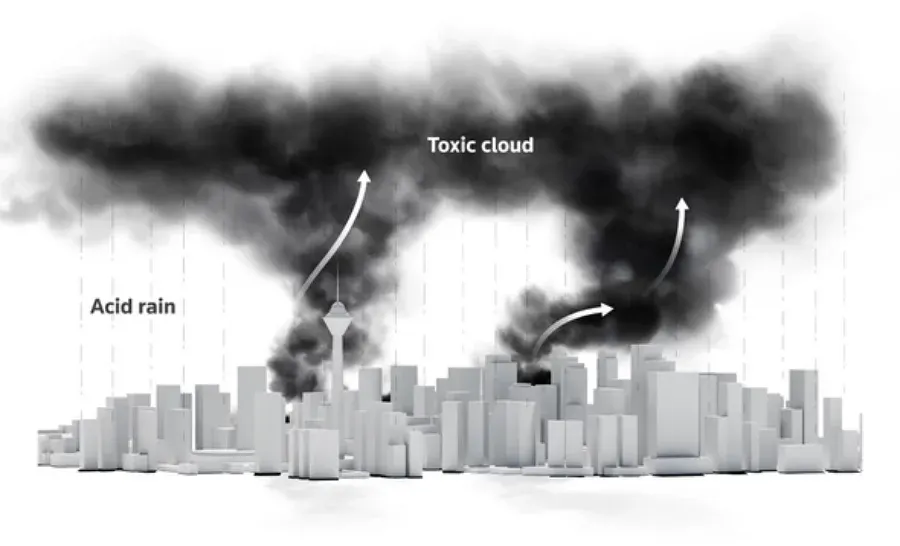 การเกิดฝนดำ: เมื่อฝนตกลงมาในพื้นที่ที่มีมลพิษหนาแน่น หยดน้ำฝนได้ดูดซับเอาเขม่าและสารเคมีเหล่านี้ลงมาด้วย ทำให้ฝนที่ตกลงมามีลักษณะเป็นสีดำ เหนียว และมีกลิ่นน้ำมันรุนแรง