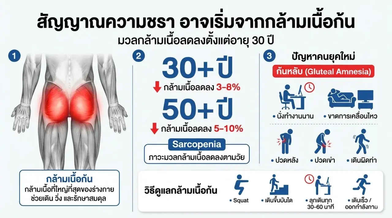 หลายคนมักกังวลกับ “ผมขาว” หรือริ้วรอยบนใบหน้า เพราะมองว่านั่นคือสัญญาณแรกของความชรา แต่ในมุมของวิทยาศาสตร์สุขภาพ นักวิจัยจำนวนไม่น้อยกลับพบว่า สัญญาณของการเสื่อมถอยของร่างกายอาจเริ่มจาก กล้ามเนื้อ มากกว่าผิวหนัง และหนึ่งในกล้ามเนื้อที่สำคัญที่สุดก็คือ กล้ามเนื้อสะโพก หรือกล้ามเนื้อก้น (Gluteus Maximus)