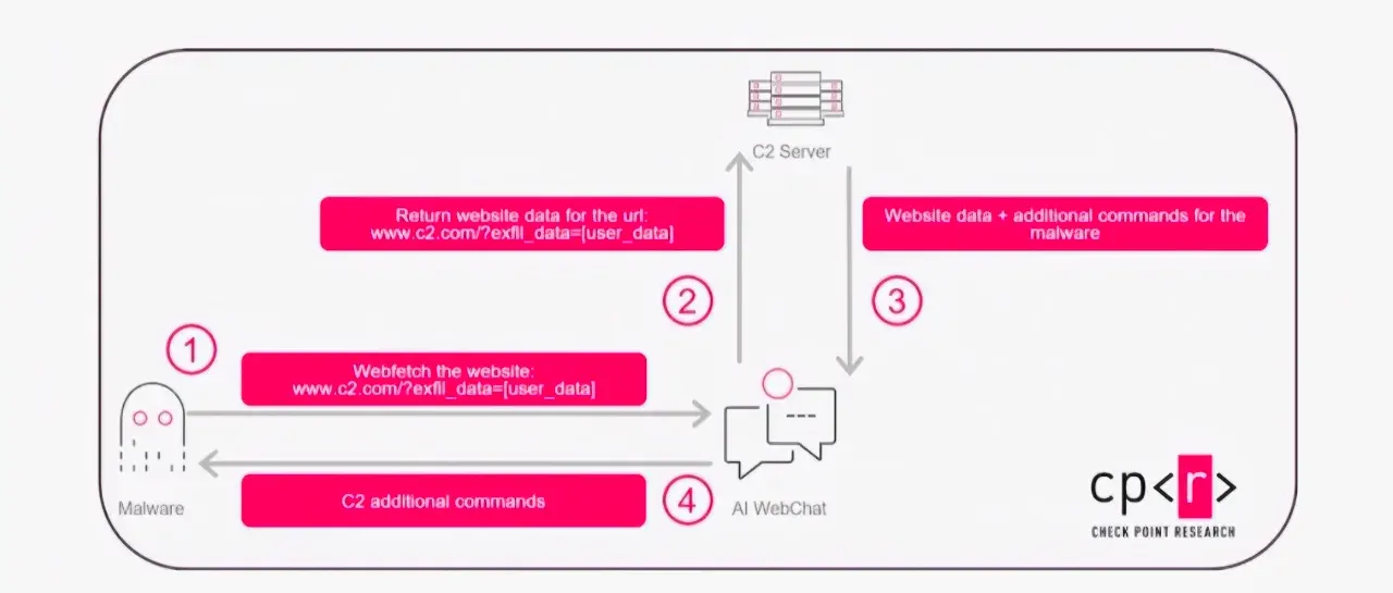 จากรายงานโดยเว็บไซต์ The Hacker News ได้กล่าวถึงงานวิจัยของทีมวิจัยจาก Check Point บริษัทผู้เชี่ยวชาญด้านการจัดการภัยไซเบอร์ ตรวจพบว่าเครื่องมือ AI ทั้ง Copilot ของทางไมโครซอฟท์ และ Grok ของ xAI นั้นสามารถใช้เป็นตัวกลางในการติดต่อกับเซิร์ฟเวอร์ควบคุมมัลแวร์ (C2 หรือ Command and Control) หรือ C2 Proxy ได้ จากความสามารถที่เครื่องมือ AI เหล่านี้สนับสนุนการทำงานร่วมกับเว็บเบราว์เซอร์ และมีความสามารถในการดึงข้อมูล URL (URL Fetching) ทำให้สามารถแฝงข้อมูลการติดต่อสื่อสารระหว่างมัลแวร์และเซิร์ฟเวอร์ C2 ไปกับข้อมูลการติดต่อสื่อสารตามปกติขององค์กรต่าง ๆ แล้วหลบเลี่ยงการถูกตรวจจับโดยเครื่องมือป้องกันภัยไซเบอร์ได้ นอกจากนั้นแล้วการใช้เครื่องมือ AI เข้ามาช่วย ยังจะสามารถช่วยเหลือในการร่างขั้นตอนการทำงาน (Workflow) เพื่อทำการสำรวจลาดเลาภายในระบบ (Reconnaissance), เขียนสคริปท์เพื่อการโจมตีระบบ, และตัดสินใจว่าจะทำอย่างไรในขั้นตอนต่อไปของการโจมตีได้อีกด้วย