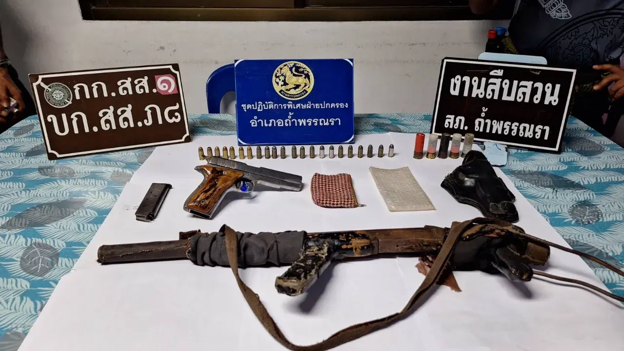 ผู้สื่อข่าวรายงานว่า เมื่อช่วงเย็นวันที่ 12 มีนาคม 2569 กำลังตำรวจสืบสวน สภ.ถ้ำพรรณรา จ.นครศรีธรรมราช นำโดย พ.ต.ต.ปรวิชญ์ เดชภรภัทร สว.สส.สภ.ถ้ำพรรณรา ร.ต.อ.ปราโมทย์ น้ำรอบ รอง สว.สส.สภ.ถ้ำพรรณรา ร่วมกับตำรวจสืบสวนภาค 8 และฝ่ายปกครอง ว่าที่ร้อยตรี วรรณวุฒิ. สมเชื้อ ปลัดอำเภอป้องกัน อ.ถ้ำพรรณรา จังหวัดนครศรีธรรมราช นำกำลังบุกจับกุม" เสือหมี " มือปืนตัวฉกาจ หลังสืบทราบว่านายโกมินทร์ อายุ 50 ปี ฉายา”เสือหมี” มือปืนรับจ้างชื่อดังลำดับต้นๆของภาค8 เคยก่อคดีฆ่าคนตายหลายศพ ล่าสุดมีหมายจับศาลจังหวัดเวียงสระในคดีฆ่าผู้อื่นพื้นที่ อ.พระแสง จ.สุราษฎร์ธานี เมื่อปี 2566 หลังก่อเหตุหนีกบดานบนภูเขาถ้ำกัลยานิมิตร หมู่ 7 ต.ดุสิต อ.ถ้ำพรรณรา จ.นครศรีธรรมราช รอยต่อ2จังหวัด ระหว่าง อ.ถ้ำพรรณรา จ.นครศรีธรรมราช กับ