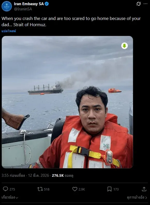 เมื่อวันที่ 12 มีนาคม 2026 สื่อบนแพลตฟอร์ม X ซึ่งใช้ชื่อว่า "Iran Embassy SA" ซึ่งแปลว่า "สถานทูตอิหร่านประจำแอฟริกาใต้" ซึ่งไม่แน่ชัดว่าเป็นเพจจริงหรือไม่ ได้โพสต์ภาพของลูกเรือชาวไทยรายหนึ่ง หลังจากสละเรือ "มยูรี นารี" ซึ่งถูกกองทัพอิหร่านโจมตี เมื่อวันที่ 11 มีนาคม 2026 โดยทาง "สถานทูตอิหร่านประจำแอฟริกาใต้" ทำเหมือนกับว่าให้ภาพดังกล่าวเป็นมีม พร้อมระบุข้อความเยาะเย้ยว่า "เมื่อคุณประสบอุบัติเหตุทางรถยนต์ แล ะกลัวเกินกว่าจะกลับบ้านเพราะพ่อของคุณ... ช่องแคบฮอร์มุซ"