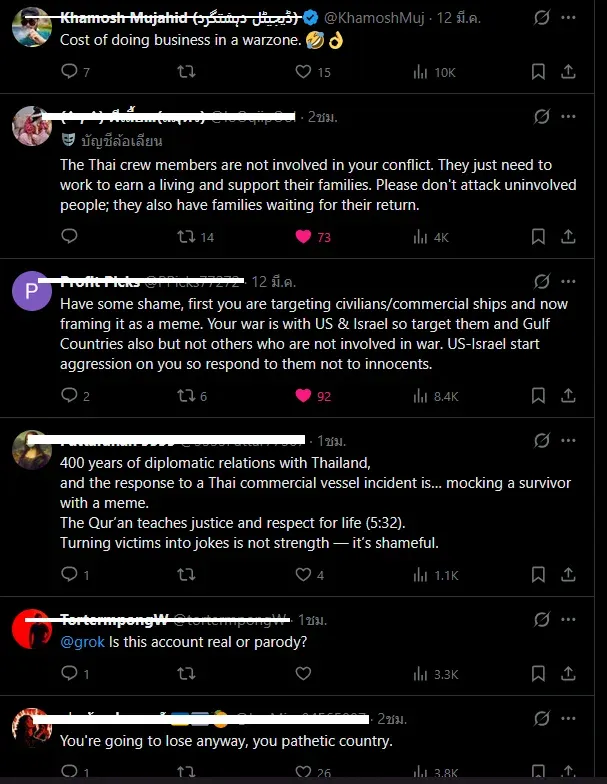 แต่เมื่อเรือพาณิชย์ไทยที่ไม่มีอาวุธถูกโจมตี ทำให้มีผู้บาดเจ็บ 20 คน และ สูญหาย 3 คน การตอบสนองกลับเป็นการเยาะเย้ยผู้รอดชีวิตด้วยมีม... นั่นไม่ใช่การทูต นั่นเป็นเรื่องน่าละอาย...