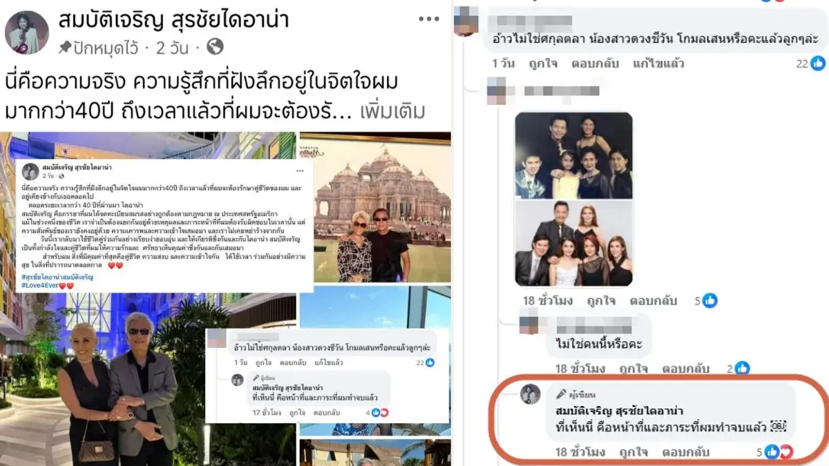 กลายเป็นประเด็นร้อนแรงที่สั่นสะเทือนวงการลูกทุ่งและโลกโซเชียล เมื่อครอบครัวของศิลปินระดับตำนานอย่าง "สุรชัย สมบัติเจริญ" ต้องเผชิญกับจุดเปลี่ยนครั้งสำคัญ หลังจากมีการเปิดตัวภรรยาใหม่ที่สหรัฐอเมริกาพร้อมคำระบุที่สร้างความสะเทือนใจให้แก่คนในครอบครัวเดิมที่ประเทศไทย นำมาสู่การประกาศจบความสัมพันธ์อย่างเด็ดขาดของ "แม่เจี๊ยบ" อดีตภรรยาที่ครองรักกันมานานกว่า 4 ทศวรรษ ท่ามกลางกระแสวิพากษ์วิจารณ์ถึงความเหมาะสมและผลกระทบทางจิตใจของผู้ที่อยู่เบื้องหลัง