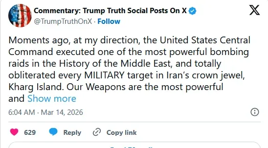 นอกจากนี้เขายังโพสต์บน X ว่า "ด้วยเหตุผลด้านมนุษยธรรม ผมได้เลือกที่จะไม่ทำลายโครงสร้างพื้นฐานด้านน้ำมันบนเกาะ" และ "หากอิหร่านหรือประเทศอื่นใด ดำเนินการใดๆที่เป็นการรบกวนเสรีภาพและความปลอดภัย ของการเดินเรือผ่าน "ช่องแคบฮอร์มุซ" ผมจะพิจารณาทบทวนการตัดสินใจดังกล่าวโดยทันที!!"