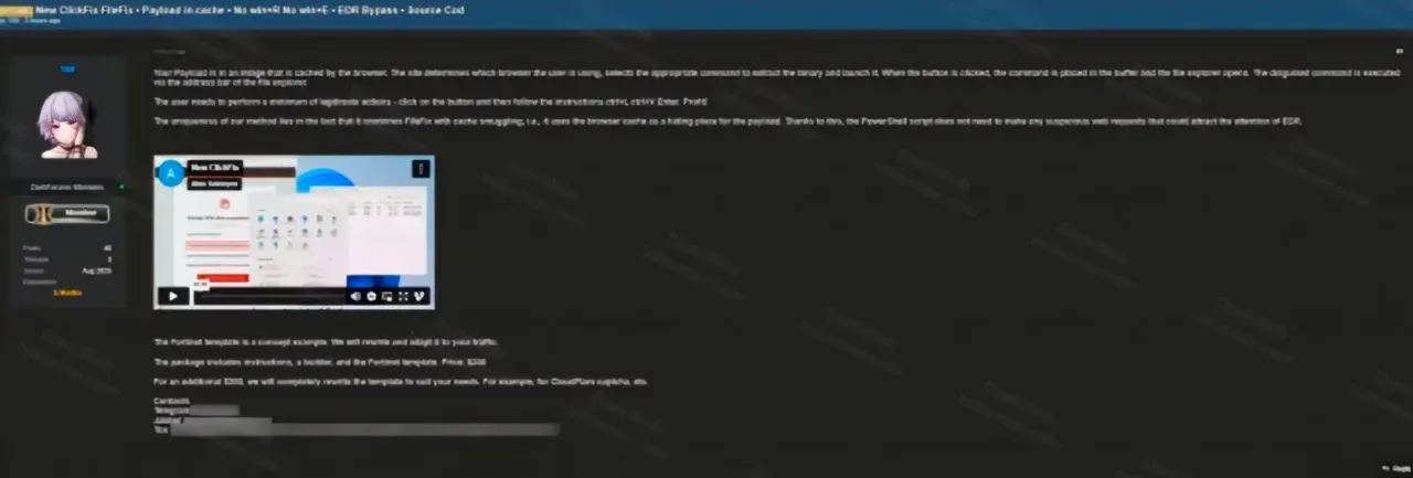 จากรายงานโดยเว็บไซต์ Cyber Press ได้กล่าวถึงการตรวจพบเครื่องมือสำหรับการหย่อน Payload ตัวใหม่ที่มีชื่อว่า ClickFix โดยทีมวิจัยอิสระจาก Dark Web Informer ได้กล่าวว่า วิธีการแบบใหม่นี้จะต่างไปจากการใช้งานการหลอกลวงแบบ ClickFix ในรูปแบบเดิม ๆ นั่นคือ ถึงแม้จะเป็นการแสดงข้อผิดพลาดแบบหลอกลวงเช่นเดียวกัน แต่ก็จะเป็นแค่ให้ผู้ใช้งานทำการคลิ๊กแค่เพียงคลิ๊กเดียว ก็จะเป็นการปล่อย Payload ลงมาจากส่วนแคช (Caches) ของตัวเว็บเบราว์เซอร์เพื่อติดตั้งมัลแวร์ลงบนเครื่องในทันที ซึ่งวิธีการดังกล่าวนี้ทางแฮกเกอร์ที่วางจำหน่ายเครื่องมือดังกล่าวผ่านทางเว็บบอร์ดใต้ดินได้โอ้อวดไว้ว่า จะทำให้เครื่องมือรักษาความปลอดภัยระดับ EDR (Endpoint Detection and Response) ไม่สามารถตรวจจับได้เลยทีเดียว เนื่องจากตัวเครื่องมือจะมองว่าเป็นเพียงซากไฟล์ที่หลงเหลืออยู่ ไม่มีอะไรผิดปกติ