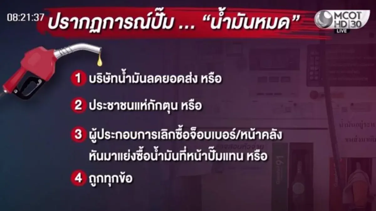 ท่ามกลางสถานการณ์ความกังวลเรื่องปริมาณน้ำมันในประเทศ รายการ "เจาะลึกทั่วไทย Inside Thailand" โดยดนัย เอกมหาสวัสดิ์ และอมรรัตน์ มหิทธิรุกข์ ได้ออกมาวิเคราะห์เจาะลึกถึงสาเหตุที่แท้จริงเบื้องหลังภาพรถต่อแถวยาวเหยียดและการติดป้ายน้ำมันหมดในหลายพื้นที่ โดยชี้ให้เห็นถึงความผิดปกติของโครงสร้างราคาที่ส่งผลกระทบโดยตรงต่อระบบการกระจายน้ำมันในขณะนี้