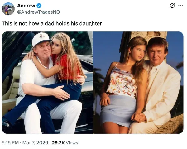 ภาพภาพปะติดที่ประกอบด้วยภาพถ่าย 2 ภาพ ซึ่งแสดงให้เห็นว่าประธานาธิบดี "โดนัลด์ ทรัมป์" ผู้นำของอเมริกา กับลูกสาวของเขา "อิวานกา ทรัมป์" ขณะนั่งอยู่บนตักตั้งแต่ยังเป็นเด็ก มักกลับมาแพร่กระจายบนโซเชียลมีเดียเป็นระยะๆ ตัวอย่างเช่น ในเดือนมีนาคม ปี 2026 มีโพสต์หนึ่งบนแพลตฟอร์ม X พร้อมคำบรรยายว่า "นี่ไม่ใช่วิธีที่พ่ออุ้มลูกสาวของเขา..."