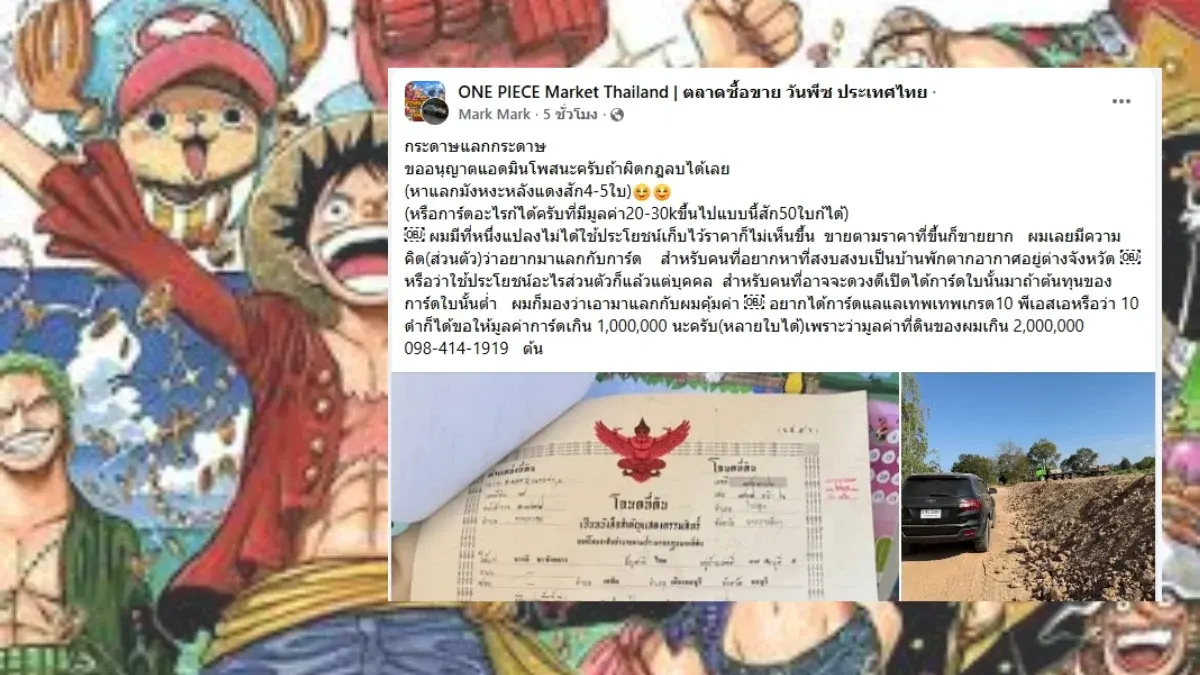 ผู้ใช้เฟซบุ๊กชื่อ Mark Mark ได้สร้างความฮือฮาด้วยการโพสต์ภาพโฉนดที่ดินพร้อมรูปถ่ายพื้นที่จริงในจังหวัดนครราชสีมา (โคราช) เพื่อประกาศหาแลกกับการ์ดวันพีซที่มีมูลค่าสูง โดยเจ้าของโพสต์ระบุเหตุผลที่น่าสนใจว่า ที่ดินผืนนี้ตนไม่ได้ใช้ประโยชน์และราคาประเมินไม่ได้ขยับขึ้นรวดเร็วเท่าที่ควร ประกอบกับการขายตามราคาตลาดทำได้ยาก จึงเกิดไอเดียอยากเปลี่ยนสินทรัพย์นี้ให้เป็นของสะสมที่ตนหลงใหลแทน