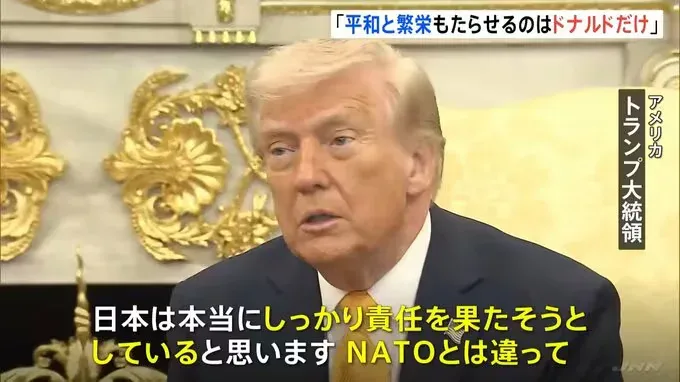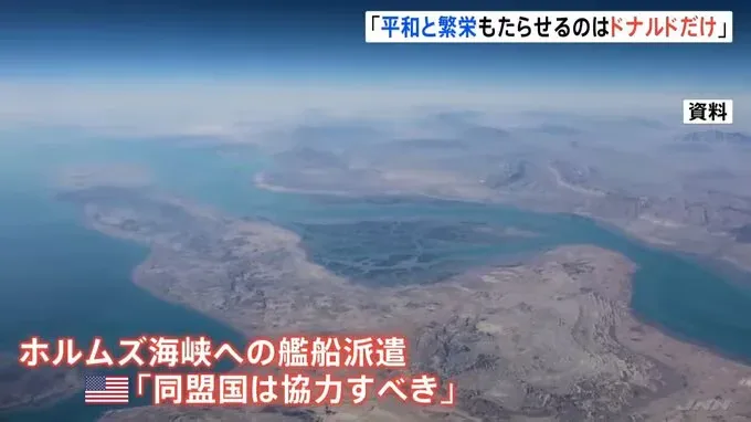 เกี่ยวกับประเด็นการส่งเรือไปยังช่องแคบฮอร์มุซ ซึ่งยังคงมีสถานการณ์ปิดกั้นอยู่ "โดนัลด์ ทรัมป์" ได้แสดงความเห็นว่า "ประเทศพันธมิตรควรร่วมมือกัน" อย่างไรก็ตาม สำหรับญี่ปุ่น "โดนัลด์ ทรัมป์" กล่าวว่า "ผมคิดว่าญี่ปุ่นกำลังพยายามทำหน้าที่ ความรับผิดชอบของตนอย่างจริงจังจริงๆ ซึ่งต่างจากนาโต้!!"