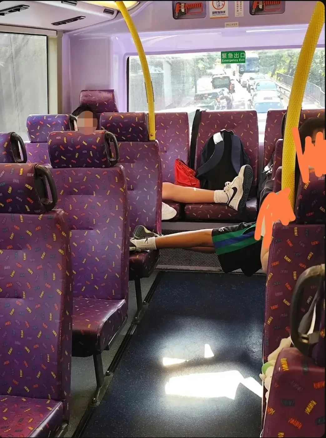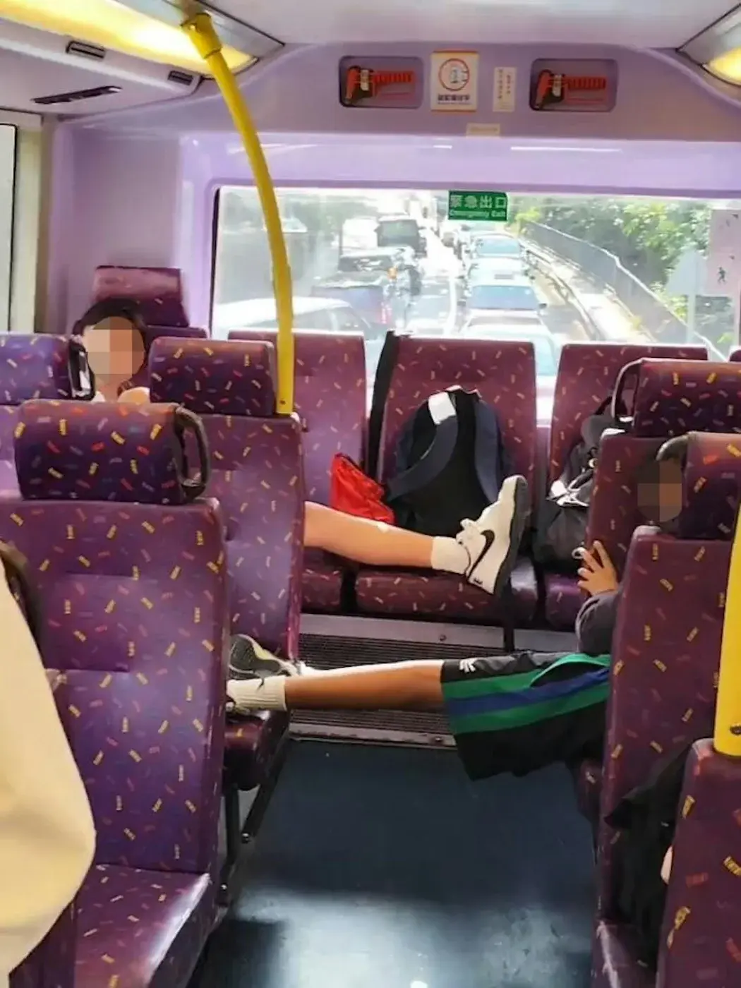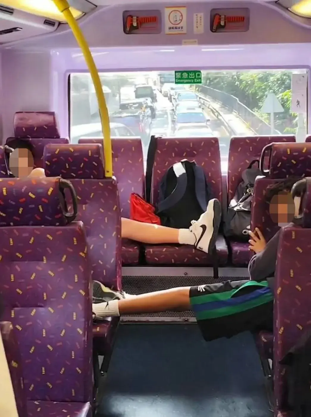 ยึดพื้นที่สาธารณะ: นักเรียนชายคนหนึ่งนั่งขวางเบาะแถวหลังสุดเพียงลำพัง โดยวางกระเป๋าเป้และพาดขาที่สวมรองเท้าอยู่บนเบาะข้างๆ รวมแล้วเขากินพื้นที่ไปถึง 4 ที่นั่ง