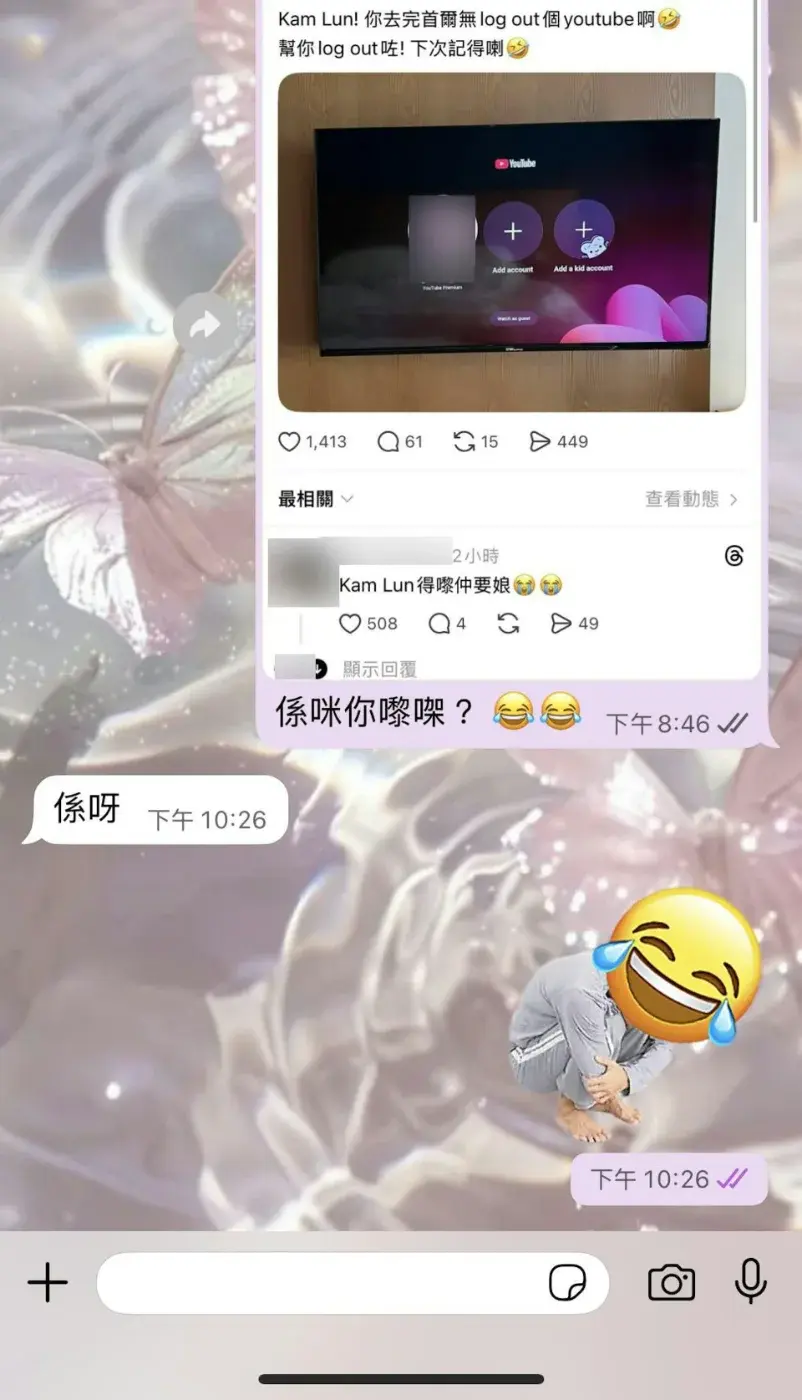 แทนที่จะกดปิดหรือเพิกเฉย หญิงสาวตัดสินใจถ่ายรูปหน้าจอ (โดยปิดบังข้อมูลส่วนตัว) และนำไปโพสต์ลงในกลุ่มชุมชนออนไลน์ชื่อดังของฮ่องกง พร้อมข้อความติดตลกว่า "คุณลืมล็อกเอาต์ YouTube ไว้ที่เกาหลีนะ ฉันช่วยล็อกเอาต์ให้เรียบร้อยแล้ว!"