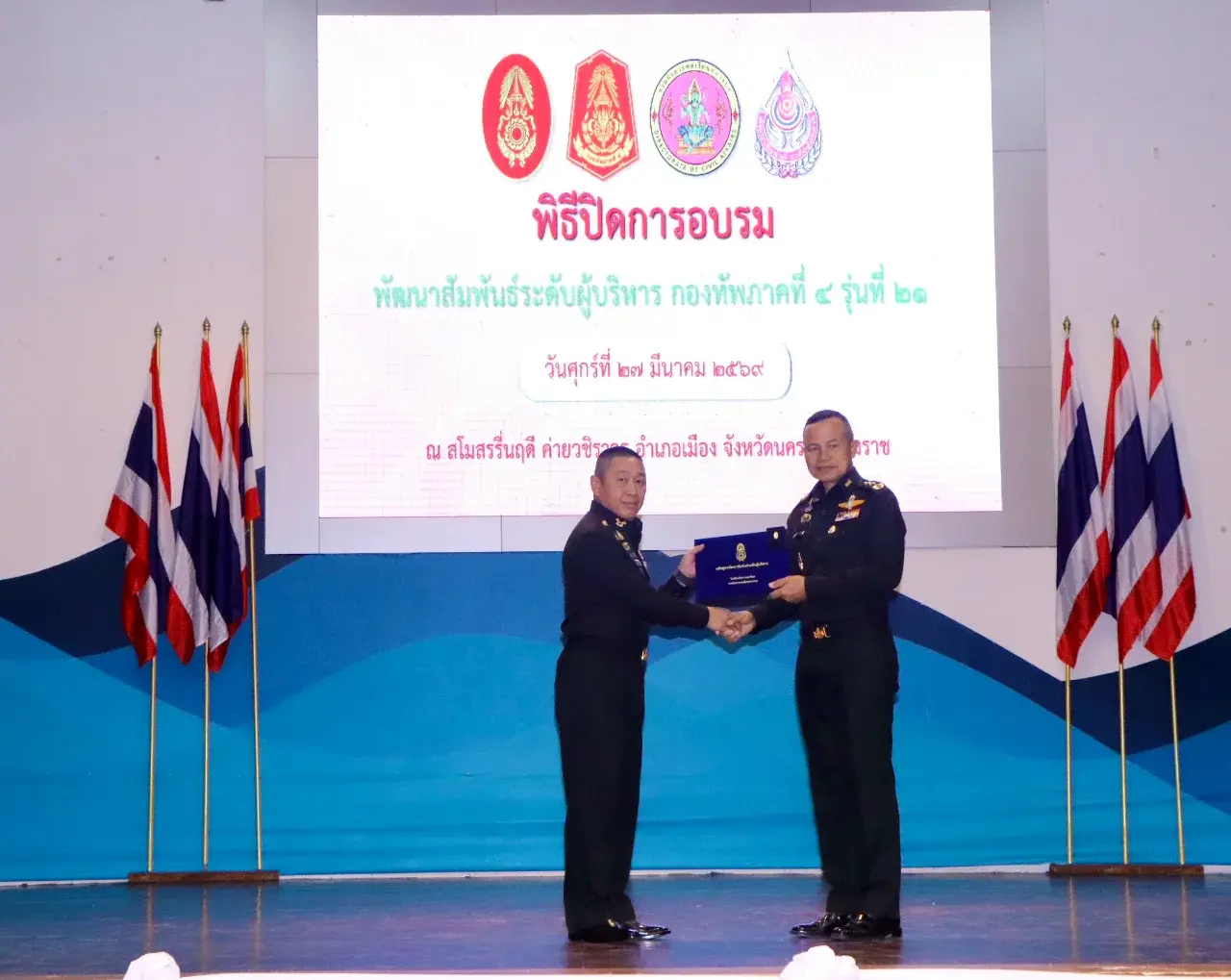 วันที่ 27 มีนาคม 2569 เวลา 10.00 น. ณ สโมสรรื่นฤดี ค่ายวชิราวุธ จังหวัดนครศรีธรรมราช พลโท นรธิป โพยนอก แม่ทัพภาคที่ 4 เป็นประธานในพิธีปิดการอบรมพัฒนาสัมพันธ์ระดับผู้บริหาร กองทัพภาคที่ 4 (พสบ.ทภ.4) รุ่นที่ 21 พร้อมมอบประกาศนียบัตรแก่ผู้สำเร็จการอบรม จำนวน 92 ราย