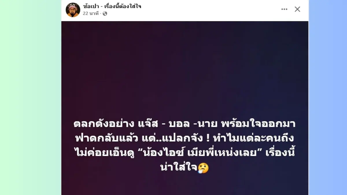 ดูเหมือนว่าความสงบหลังงานไว้อาลัยตลกดัง "เหน่ง เหม่งจ๋าย" จะอยู่ได้ไม่นาน เมื่อกลิ่นอายดราม่าเริ่มโชยมาแรงขึ้นเรื่อยๆ หลังจากที่ "ไอซ์" ภรรยาคู่ชีวิตของเหน่งออกมาโพสต์ทิ้งบอมบ์ลูกใหญ่ผ่านเฟซบุ๊กส่วนตัวว่า "จบงานแล้ว ก็เลิกสร้างภาพสักทีนะคะ อย่าให้เหลานะคะ ไม่อยากทำ" จนกลายเป็นประเด็นที่คนดังใกล้ชิดหลายคนต้องนั่งไม่ติด โดยเฉพาะกลุ่มเพื่อนพี่น้องตลกอย่าง แจ๊ส ชวนชื่น, บอล เชิญยิ้ม และนาย เดอะคอมเมเดี้ยน ที่ตัดสินใจออกมาไลฟ์สดชี้แจงและซัดกลับปม "หาแสง" ที่กำลังลามไปทั่วโซเชียล