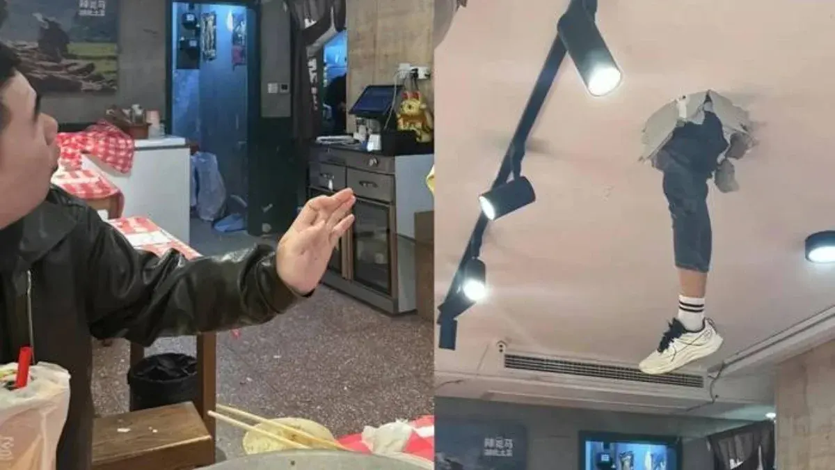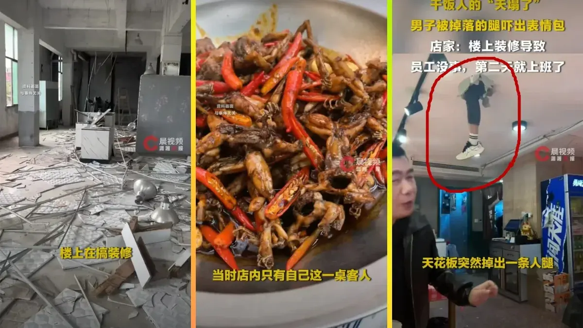 เหตุการณ์นี้เกิดขึ้นที่เมืองอู่ฮั่น ประเทศจีน เมื่อวันที่ 21 มีนาคม 2569 ที่ผ่านมา ในขณะที่บรรยากาศภายในร้านอาหารกำลังคึกคัก จู่ ๆ แผ่นฝ้ายิปซัมบนเพดานก็เกิดรับน้ำหนักไม่ไหวพังครืนลงมา สิ่งที่ปรากฏต่อสายตาไม่ใช่เพียงเศษฝุ่นหรือปูน แต่กลับเป็นขาของมนุษย์ที่ดิ่งลงมาติดค้างอยู่กลางอากาศ สร้างความแตกตื่นจนร้านต้องรีบอพยพคนออกทันทีเพื่อความปลอดภัย
