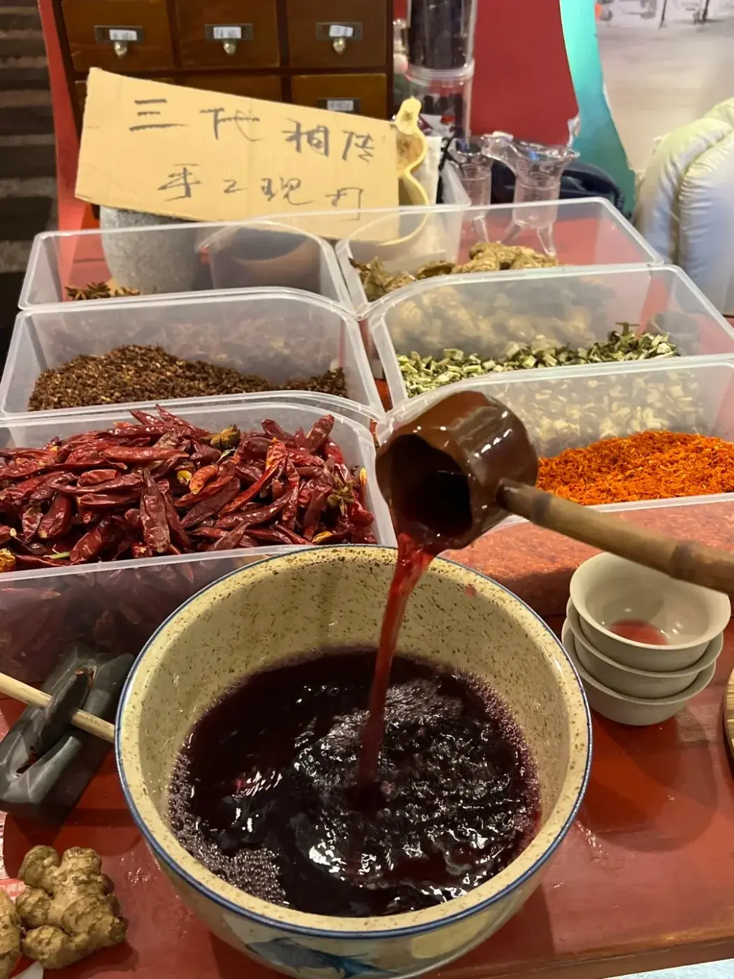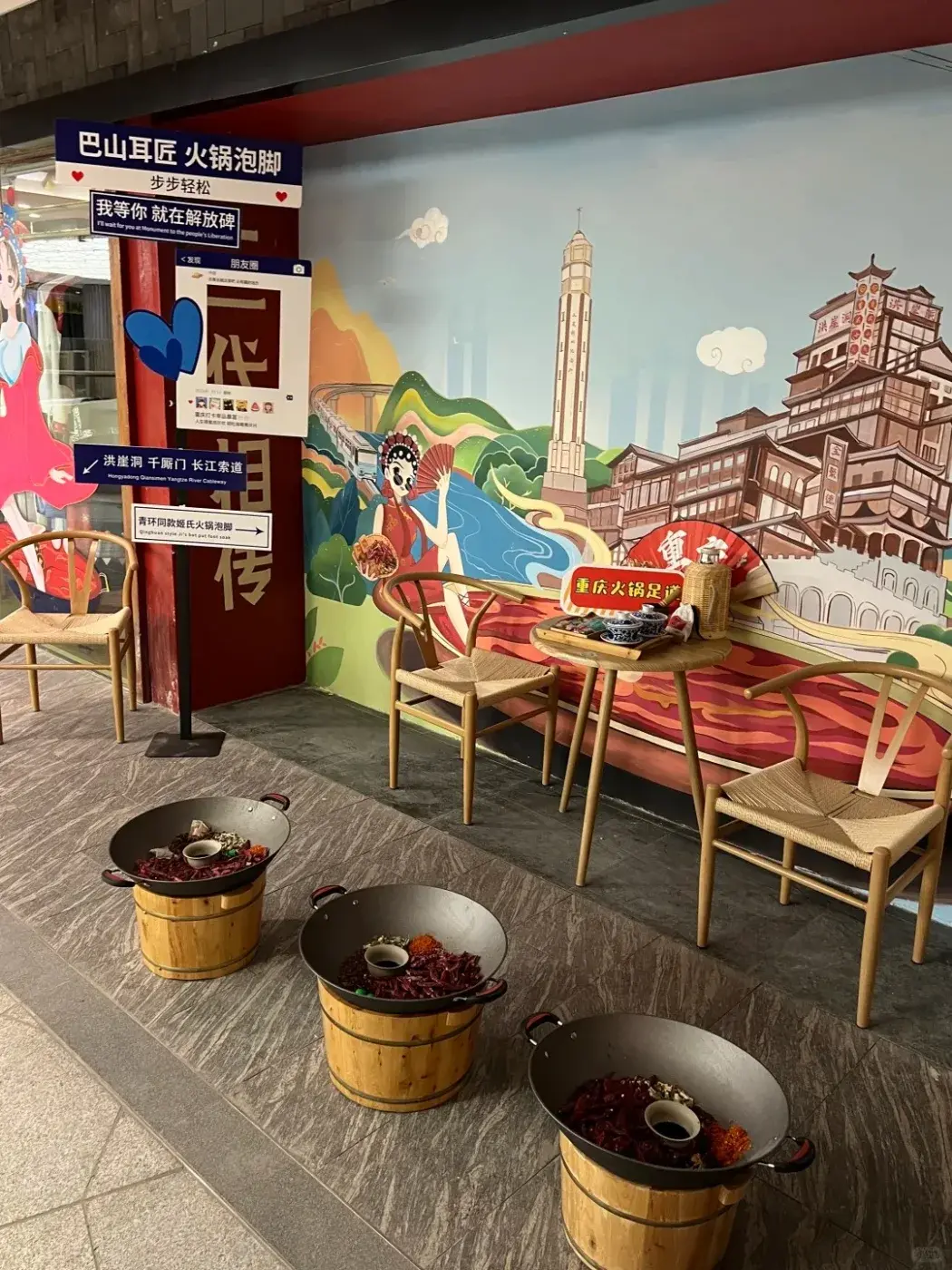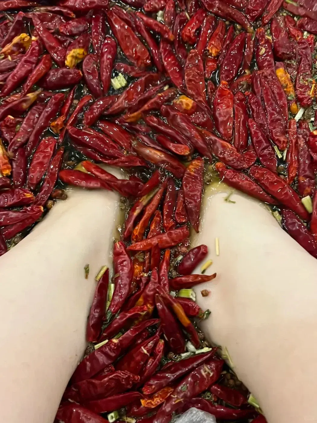 พูดกันตรงๆ คนฉงชิ่งนี่ช่างคิดสร้างสรรค์บริการล้ำสมัยจริงๆ ใครจะไปคิดว่าไปนวดเท้าแล้วพนักงานจะยกหม้อไฟทองแดงใบใหญ่ควันฉุยมาให้ แถมน้ำข้างในยังสีแดงเข้มเหมือนน้ำซุปหม่าล่า มีทั้งพริก หม่าล่า มะนาว ขิง และ สมุนไพรลอยเต็มไปหมด เหมือนหม้อไฟเสฉวนเผ็ดระดับหมื่นสโควิลล์ แต่ไม่ต้องตกใจไป เพราะถึงหน้าตาจะดูโหด แต่นี่คือการแช่เท้าสมุนไพรแบบดั้งเดิม ที่ถูกยกระดับให้ดูน่าสนใจยิ่งขึ้น น้ำสีแดงนั้นไม่ใช่น้ำมันพริก แต่เป็นส่วนผสมของเกลือสมุนไพร น้ำมันหอมระเหย กุหลาบ และ ยาจีนที่ช่วยกระตุ้นการไหลเวียนโลหิต โดยพริกและเครื่องเทศที่ลอยอยู่ก็เป็นของจริง แต่มีไว้เพื่อสร้างบรรยากาศและกลิ่นหอมผ่อนคลาย ไม่ได้ทำให้แสบหรือระคายเคืองแต่อย่างใด ความกังวลจะหายไปทันทีที่ลองจุ่มเท้าลงในน้ำอุ่น ที่ช่วยคลายความเมื่อยล้าอย่างนุ่มนวล