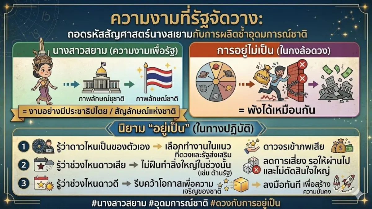 นางสาวสยามจึงเป็นมากกว่าผู้ชนะการประกวด แต่คือ "สัญลักษณ์" ที่ถูกสร้างขึ้นเพื่อทำหน้าที่ผลิตซ้ำมายาคติของรัฐในแต่ละยุคสมัย ผ่านจังหวะเวลาทางประวัติศาสตร์ที่แตกต่างกันไป การเท่าทันมายาคติเหล่านี้จะช่วยให้เรามองเห็นโครงสร้างอำนาจที่ซ่อนอยู่เบื้องหลังรอยยิ้มและมงกุฎ ซึ่งยังคงทำหน้าที่เป็นกระจกสะท้อนอุดมการณ์ของสังคมไทยมาจนถึงปัจจุบัน