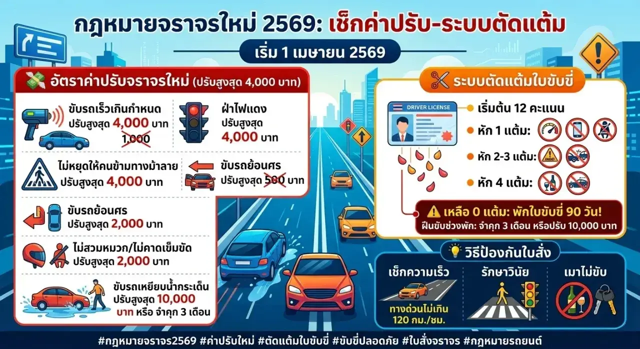 💰 สรุปอัตราค่าปรับจราจรใหม่ 2569 (ปรับสูงสุด 4,000 บาท)