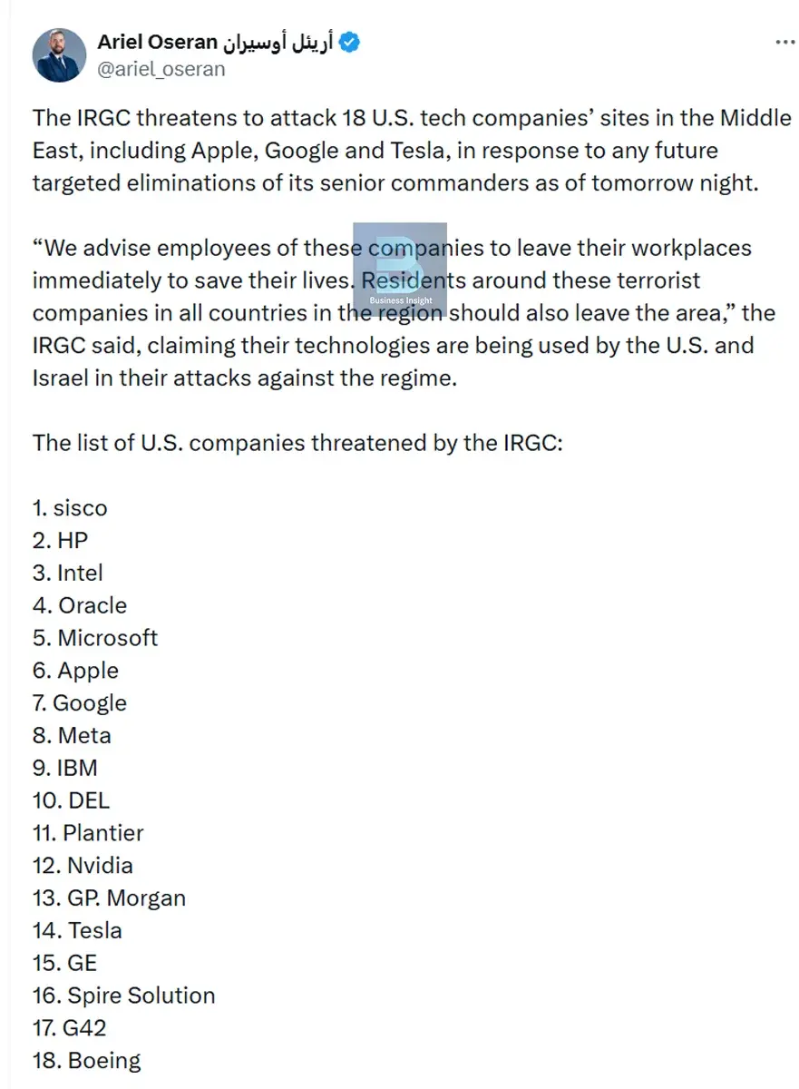 IRGC ได้ระบุรายชื่อ 18 บริษัทระดับโลกที่อ้างว่าเป็นเป้าหมายที่ "ชอบธรรม" ในการโจมตี ซึ่งครอบคลุมยักษ์ใหญ่ด้านไอที การเงิน ยานยนต์ และอวกาศ ดังนี้: