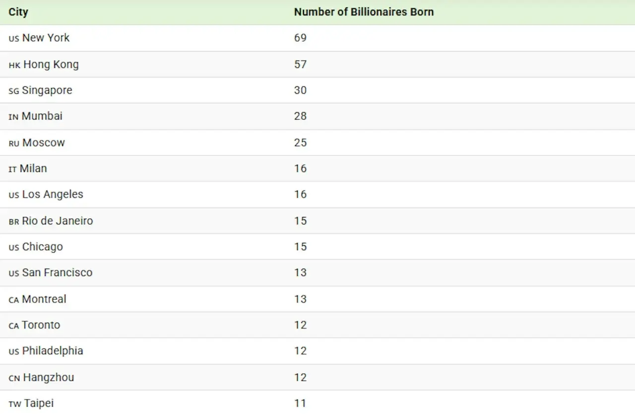 จากการจัดอันดับพบว่า นิวยอร์ก (New York) ประเทศสหรัฐอเมริกา ยังคงครองอันดับ 1 ของโลก โดยเป็นเมืองกำเนิดของมหาเศรษฐีถึง 69 คน มหาเศรษฐีชื่อดังที่เป็นชาวนิวยอร์กโดยกำเนิดคือ Larry Ellison ผู้ร่วมก่อตั้ง Oracle ซึ่งมีทรัพย์สินมหาศาลติดอันดับโลก