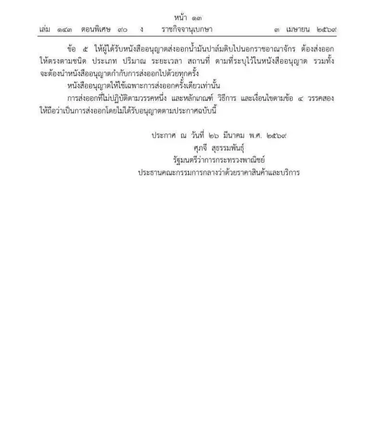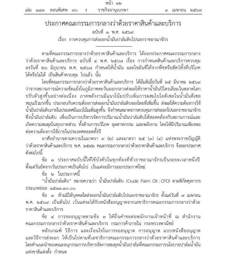 ราชกิจจานุเบกษาเผยแพร่ประกาศสำคัญ คณะกรรมการกลางว่าด้วยราคาสินค้าและบริการ เดินหน้าคุมเข้ม “น้ำมันปาล์มดิบ (CPO)” สั่งห้ามส่งออกนอกราชอาณาจักรเป็นระยะเวลา 1 ปี เริ่มมีผลตั้งแต่วันที่ 7 เมษายน 2569 เป็นต้นไป